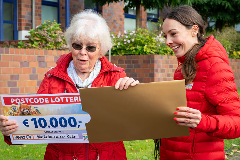 Zum fünften Mal in diesem Monat ist unser Team für den Straßenpreis unterwegs. Mit im Gepäck: ein bunter Blumenstrauß und 10.000 Euro. Im Postcode 45472 EV erwartet Angelika aufgeregt unseren Besuch und jubelt dann über den großen Scheck.