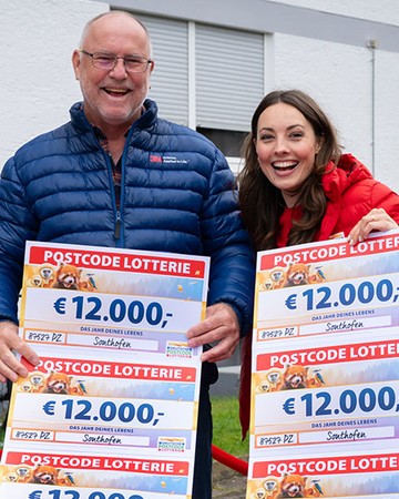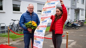 Als Rainer den ersten Scheck über 12.000 Euro in den Händen hält, ist er sprachlos. Doch es bleibt nicht bei einem: Insgesamt 12 Schecks enthüllt unsere Glücksbotin Julia – das bedeutet ein ganzes Jahr lang jeden Monat 12.000 Euro pro Los.