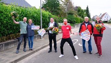Heute hat Felix mal wieder alle Hände voll zu tun. Für diesen Straßenpreis in Löhne hat er fünf Blumensträuße und neun goldene Umschläge im Gepäck, mit denen er die Glückspilze aus dem Postcode 32584 TW überrascht.
