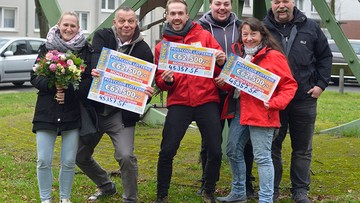 Echtes Lotterieglück haben zwei Nachbarn aus Gerschede: Michael und Sabine. Ihr Postcode 45357 SF sichert sich den Monatsgewinn der Februar-Ziehung. Da Michael mit drei Losen an unseren Ziehungen teilnimmt, überreicht ihm Felix auch drei Schecks – jeder über 62.500 Euro. Er gewinnt also sage und schreibe 187.500 Euro. Nachbarin Sabine freut sich mit einem Los über 62.500 Euro.