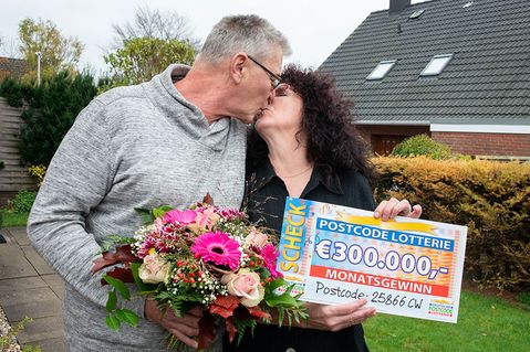 Ute gewinnt mit ihrem Postcode 25866 CW sage und schreibe 300.000 Euro. Alle Teilnehmer mit der passenden Postleitzahl teilen sich weitere 300.000 Euro – das bedeutet für die glücklichen Mildstedter 6.383 Euro pro Los. Da gibts jede Menge Schecks zu verteilen.