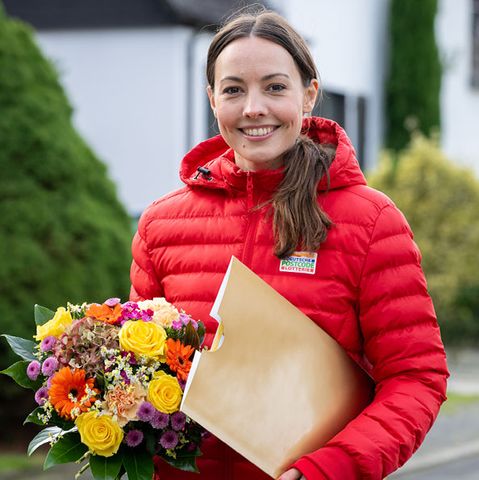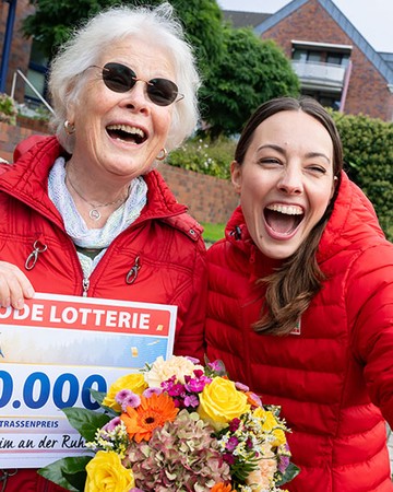 Zum fünften Mal in diesem Monat ist unser Team für den Straßenpreis unterwegs. Mit im Gepäck: ein bunter Blumenstrauß und 10.000 Euro. Im Postcode 45472 EV erwartet Angelika aufgeregt unseren Besuch und jubelt dann über den großen Scheck.
