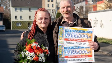 Giuliano steht mit zwei großen Schecks in glänzenden goldenen Umschlägen vor Thomas Tür. Der 49-jährige Hobby-Bogenschütze fiebert gemeinsam mit seiner Lebensgefährtin Kirstin auf den großen Moment hin. Dann ziehen die beiden den ersten Scheck hervor und sehen, dass er mit seinem Postcode 53129 BQ voll ins Schwarze getroffen hat. 350.000 Euro! Sie können ihr Glück kaum fassen, ihnen fehlen die Worte. Thomas flüstert: "Da lösen sich gerade wirklich viele, viele Probleme in Luft auf. Danke."