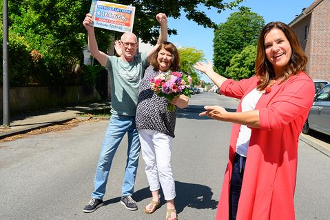 Herzlichen Glückwunsch nach Aachen! Hierhin geht die unglaubliche Summe von 1.000.000 Euro. Der gezogene Postcode für den Monatsgewinn im Juni lautet: 52080 DS. Zwei Glückspilze mit insgesamt drei Losen teilen sich hier 500.000 Euro! Unsere Botschafterin, die zweifache Olympiasiegerin im Eiskunstlauf, Katarina Witt überrascht die Postcode-Gewinner persönlich.