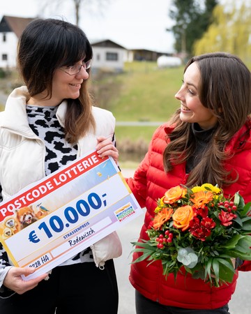 Der erste Straßenpreis im April landet im Postcode 08228 HA. Unsere glückliche Gewinnerin Katrin jubelt im Städtchen Rodewisch über 10.000 Euro pro Los. So einen großartigen Gewinn überreichen wir natürlich persönlich – herzlichen Glückwunsch!