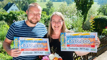 Als Felix die Gebäudereinigerin und ihren Mann Jens mit zwei großen Schecks über jeweils 150.000 Euro überrascht, fehlen unserer Monatsgewinnerin die Worte: "Das ist viel Geld. Sehr viel Geld. Wow." Mit 300.000 Euro rückt für die Großfamilie aus Klettgau der Traum vom eigenen Haus endlich in greifbare Nähe. Birgit freut sich: "Wie lang wir dafür arbeiten müssten. Schön, sehr schön. Es lohnt sich doch, für andere was zu tun. Es kommt alles wieder zurück im Leben."