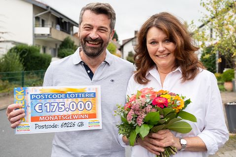 Auch Michael und Karina haben ein Los im gezogenen Postcode. Das Ehepaar ist sehr aufgeregt, als Felix klingelt. Als die beiden ihren Scheck aus dem goldenen Umschlag ziehen, können sie ihr Glück kaum fassen: "Ah ne, oder? Wir sind überwältigt!“ Die beiden Glückspilze jubeln gemeinsam über 175.000 Euro und wissen sofort, was sie mit dieser gewaltigen Summe anfangen: "Wir können die Hochzeit unseres Sohnes bezahlen, das kriegt er als Geschenk. Der andere Sohn bekommt ein gebrauchtes Auto. Und der Rest bleibt für uns!"