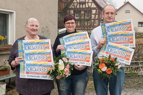 Das gab es bei der Postcode Lotterie noch nie: Mutter Erika, Sohn Thorsten und seine Partnerin Anja aus St. Gangloff, das auch im Postleitzahlenbereich 07629 liegt, gewinnen mit jeweils drei Losen. Neun Schecks! Da hat Giuliano im wahrsten Sinne des Wortes alle Hände voll zu tun.