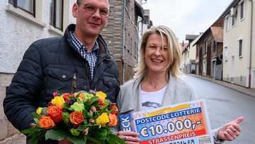 Den ersten Straßenpreis der März-Ziehung überbringt Giuliano im hessischen Waldkappel. Im Postcode 37284 EB kann Tina das Konfetti zücken: Herzlichen Glückwunsch zu 10.000 Euro!