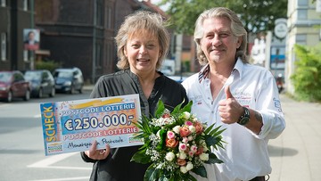 Doch 32 weitere Teilnehmer durften sich an diesem Wochenende ebenfalls freuen: Da sie in der dazu gehörigen Postleitzahl im Stadtteil Katernberg wohnen, erhielten auch sie Besuch von Postcode Moderator Felix Uhlig, der ihnen pro Los Schecks im Wert von 5.000 Euro überreichte. So werden der 62-jährigen Postleitzahlen-Gewinner Udo und seine Frau Cornelia dank ihrer Postleitzahl ebenfalls am Monatsgewinn beteiligt und erhalten 5.000 Euro. Das Ehepaar hatte sich zur Teilnahme entschlossen, nachdem ihre Tochter 1.000 Euro gewann. Im Vordergrund stand für das Ehepaar auch die Unterstützung der Förderprojekte. Beide engagieren sich im sozialen Bereich.