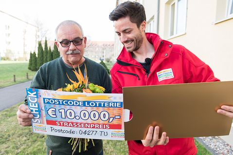 Im Postcode 04277 TU gibt es vierfachen Anlass zur Freude! Giuliano überrascht Rene mit drei Schecks im goldenen Umschlag und Nachbarn Franz mit einem Gewinnscheck. Die Leipziger haben mit ihrem Postcode Glück beim ersten Straßenpreis der März-Ziehung und gewinnen zusammen insgesamt 40.000 Euro.