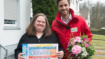 Wir gratulieren Hans-Georg zum zweiten Straßenpreis der März-Ziehung. Mit seinem Postcode 49214 FZ und einem Los hat er Glück und kann sich über 10.000 Euro freuen. Leider liegt er derzeit in der Klinik, daher nimmt seine Frau Yvonne den Scheck für ihren Mann entgegen.