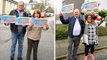 Nebenan wohnen Kerstin und Udo – die nächsten Gewinner. Das Ehepaar nimmt erst seit Januar mit je einem Los an unseren Ziehungen teil und schon klingelt Felix mit zwei Schecks über jeweils 10.000 Euro an der Tür. Da Kerstin an diesem Überraschungstag verhindert ist, übernimmt spontan Tochter Jessica die schöne Aufgabe und zieht den Scheck aus dem Umschlag. Insgesamt 20.000 Euro – die Freude ist groß. Berufskraftfahrer Udo, ein passionierter Cabriolet-Fahrer, weiß auch gleich, was er sich von dem Geld leisten möchte: "Jetzt holen wir uns zwei E-Bikes", sagt der 60-Jährige und herzt dabei seine Tochter.