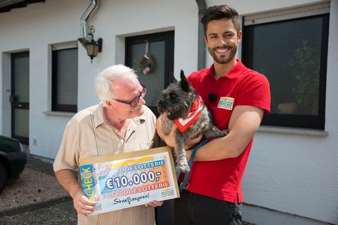 Doppelt schöner Besuch für Paul* aus Nohfelden: Nachdem sein Postcode für den Straßenpreis gezogen wurde, klingelte nicht nur das Team der Deutschen Postcode Lotterie an seiner Haustür, um ihm den Scheck zu überreichen, Moderator Giuliano Lenz hatte auch tierische Überraschungsgäste dabei.