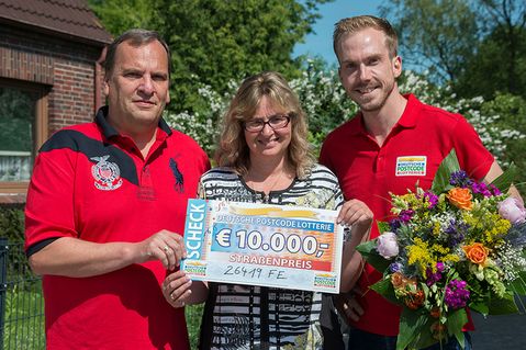 Hier sind aller guten Dinge zwei! Zum zweiten Mal geht unser Straßenpreis nach Schortens in Niedersachsen. Zwei glückliche Gewinner freuen sich im Postcode 26419 SM über den zweiten Straßenpreis der Juni-Ziehung – ziemlich genau ein Jahr nachdem wir hier schon eine Gewinnerin mit einem großen Scheck überraschen konnten.