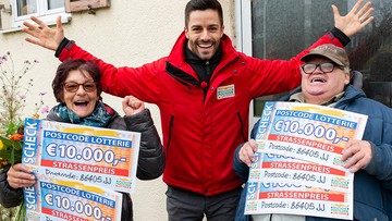Giuliano packt gleich fünf 10.000 Euro-Schecks ein und macht sich im Postcode-Mobil auf den Weg nach Bayern. Der zweite Straßenpreis der November-Ziehung wird in Meitingen im Postcode 86405 JJ gefeiert. Hier haben zwei Glückspilze allen Grund zur Freude.