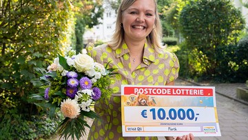 Im Postcode 90768 QN jubelt Alexandra über den zweiten Straßenpreis der September-Ziehung. Giuliano überrascht unseren Glückspilz mit einem hübschen Strauß Blumen und 10.000 Euro. Herzlichen Glückwunsch nach Fürth!