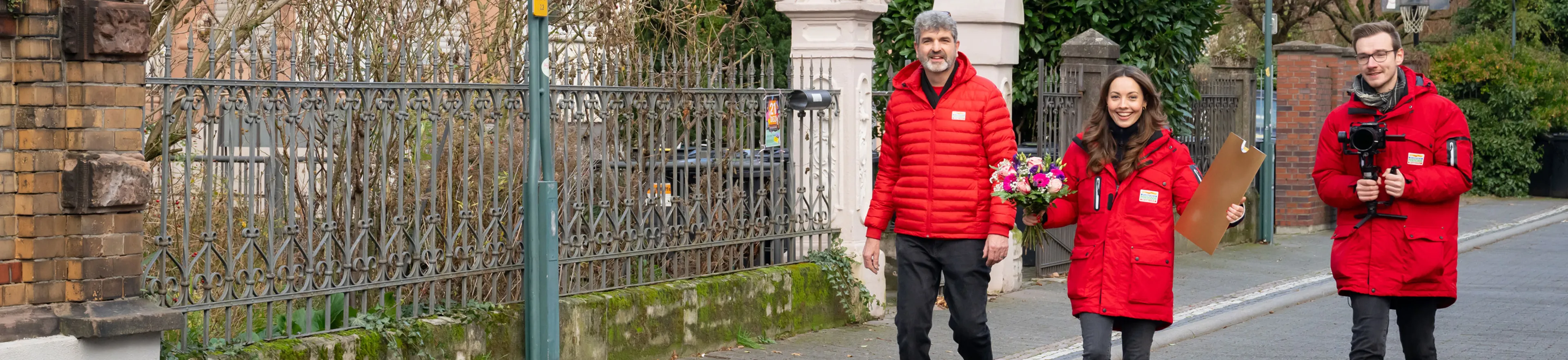 Beim dritten Straßenpreis jubelt eine glückliche Teilnehmerin im Postcode 64293 GF über fantastische 10.000 Euro. Unser Team besucht Brigitte und ihren Mann Hans persönlich und packt neben Blumensträußen natürlich auch den goldenen Umschlag ein.