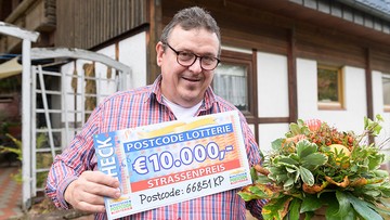 Es ist wieder Samstag – das bedeutet, es ist Zeit für unseren Straßenpreis! Dieser fällt auf den Postcode 66851 KP nach Steinalben in Rheinland-Pfalz. Im Regen fährt unser Team bei Heinrich vor, dessen Laune das Wetter nicht trübt. Straßenpreis-Moderator Giuliano überreicht ihm einen Scheck über 10.000 Euro.