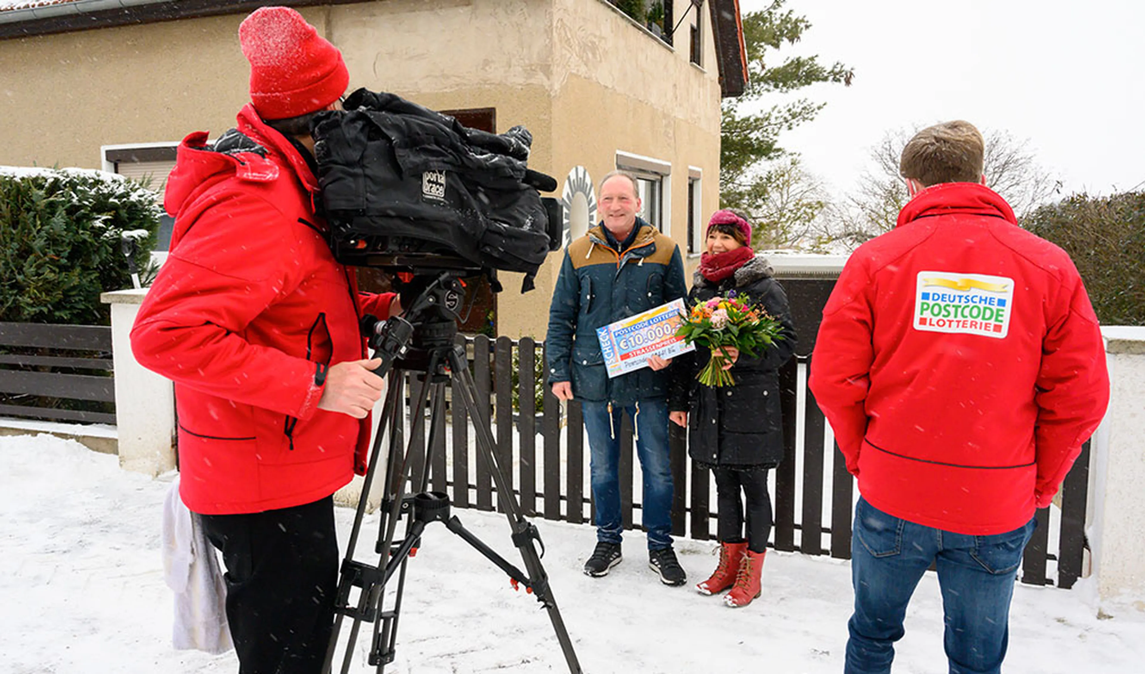 Herzlichen Glückwunsch in den Postcode 99441 BS zum dritten Straßenpreis der Januar-Ziehung! Felix hat sich gemeinsam mit einem kleinen Team auf den Weg ins verschneite Kleinschwabhausen in Thüringen gemacht – hier überrascht er Torsten mit einem großen Scheck über 10.000 Euro!