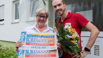Sie hat Glück mit ihrem Postcode 68723 MP beim dritten Straßenpreis im Juni. Mit zwei Losen ist die fröhliche Schwäbin auf einen Schlag um 20.000 Euro reicher.