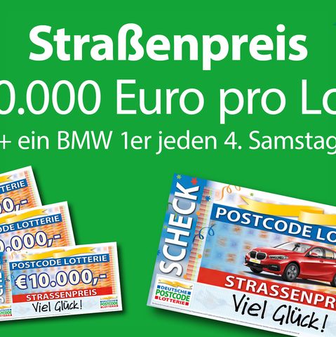 Dieser Straßenpreis landet im Postcode 63329 AV. Eine glückliche Gewinnerin aus Hessen freut sich mit ihrem Los über 10.000 Euro. Doch das ist noch nicht alles! Zusätzlich gibt's einen nagelneuen BMW 1er, denn es ist der vierte Straßenpreis des Monats. Wohin wohl die allererste Fahrt geht?