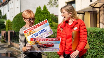 Beatrice überrascht Gabi mit zwei goldenen Umschlägen an der Haustür und erfährt die lustige Geschichte, wie die frisch gebackene Gewinnerin auf die Postcode Lotterie kam.