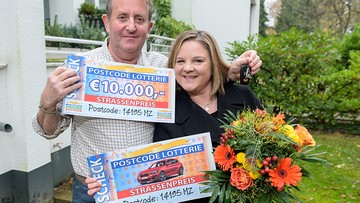 Steven freut sich mit seiner Frau Isabelle über 10.000 Euro und einen BMW 1er