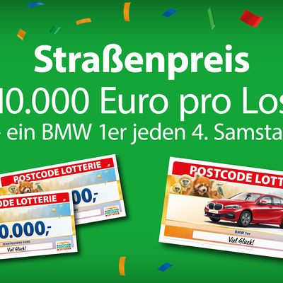Immer samstags gewinnt ein Postcode beim Straßenpreis 10.000 Euro pro Los. Mit drei Losen haben Sie die Chance auf satte 30.000 Euro! Damit nicht genug – zusätzlich verlosen wir am 4. Samstag im Monat noch ein Auto.