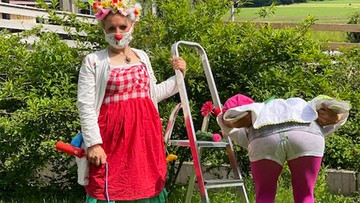 Sie unterhalten die kleinen Patienten vor deren Fenstern. Dr. Genusswurzel berichtet: "Lucia und ich haben uns entschieden, mit Mundschutz zu spielen – Vorbildfunktion für die Kinder. Wir schafften es mit Hilfe von einer Staffelei und einen rund fünf Meter langen, selbstkonstruierten Stab Luftballons und Nasen zu den Kindern zu reichen." Die Kinder können so aus sicherem Abstand zuschauen und ihre Sorgen für eine gewissen Zeit vergessen. Denn lachen ist und bleibt doch die beste Medizin.