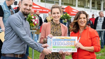 Teach First Deutschland setzt schon in der Schule an, damit alle Kinder gute Bildung und Teilhabe erfahren. Elke Büdenbender, die Frau des Bundespräsidenten Frank-Walter Steinmeier, ist die Schirmherrin der Organisation. Dank unserer Teilnehmerinnen und Teilnehmer können wir diesen Beitrag zur Chancengleichheit mit 184.000 Euro unterstützen. Einen symbolischen Scheck überreicht Katarina Witt, zweifache Eiskunstlauf-Olympiasiegerin und Botschafterin der Postcode Lotterie, beim Monatsgewinn in Hamburg an Regionalreferentin Fundraising Laura Pischek und Fellow Dorian Anders von Teach First Deutschland. "Es ist ein tolles Gefühl hier auch mal die Teilnehmerinnen und Teilnehmer zu sehen. Wir sind sehr dankbar und freuen uns riesig über die tolle Förderung", bedankt sich Laura Pischek.