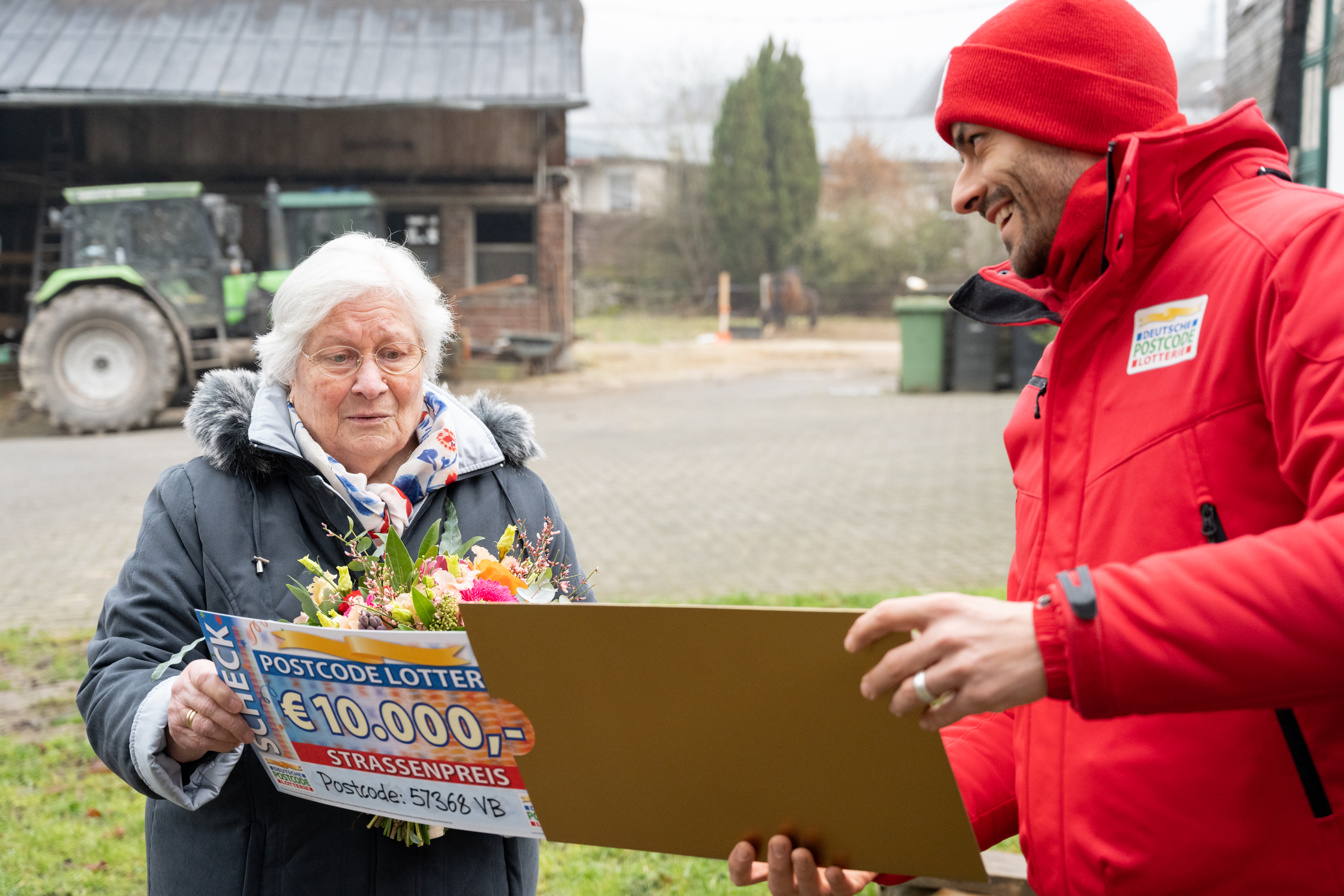 Derart willkommene Geburtstagsgäste hatte Roswitha selten: An ihrem 81. Geburtstag steht das Team der Deutschen Postcode Lotterie in knallroten Jacken vor der Haustür. Im Gepäck einen großen goldenen Umschlag, denn die Sauerländerin hat mit ihrem Los beim dritten Straßenpreis im Januar gewonnen. Ganz langsam zieht sie einen großen 10.000-Euro-Scheck hervor und ist sichtlich überwältigt. „Das ist umso schöner – so ein Geburtstagsgeschenk. Davon kriegen jetzt alle etwas.“ Mit ‚alle‘ meint die 81-Jährige ihre Kinder, Enkel und den kleinen Urenkel.