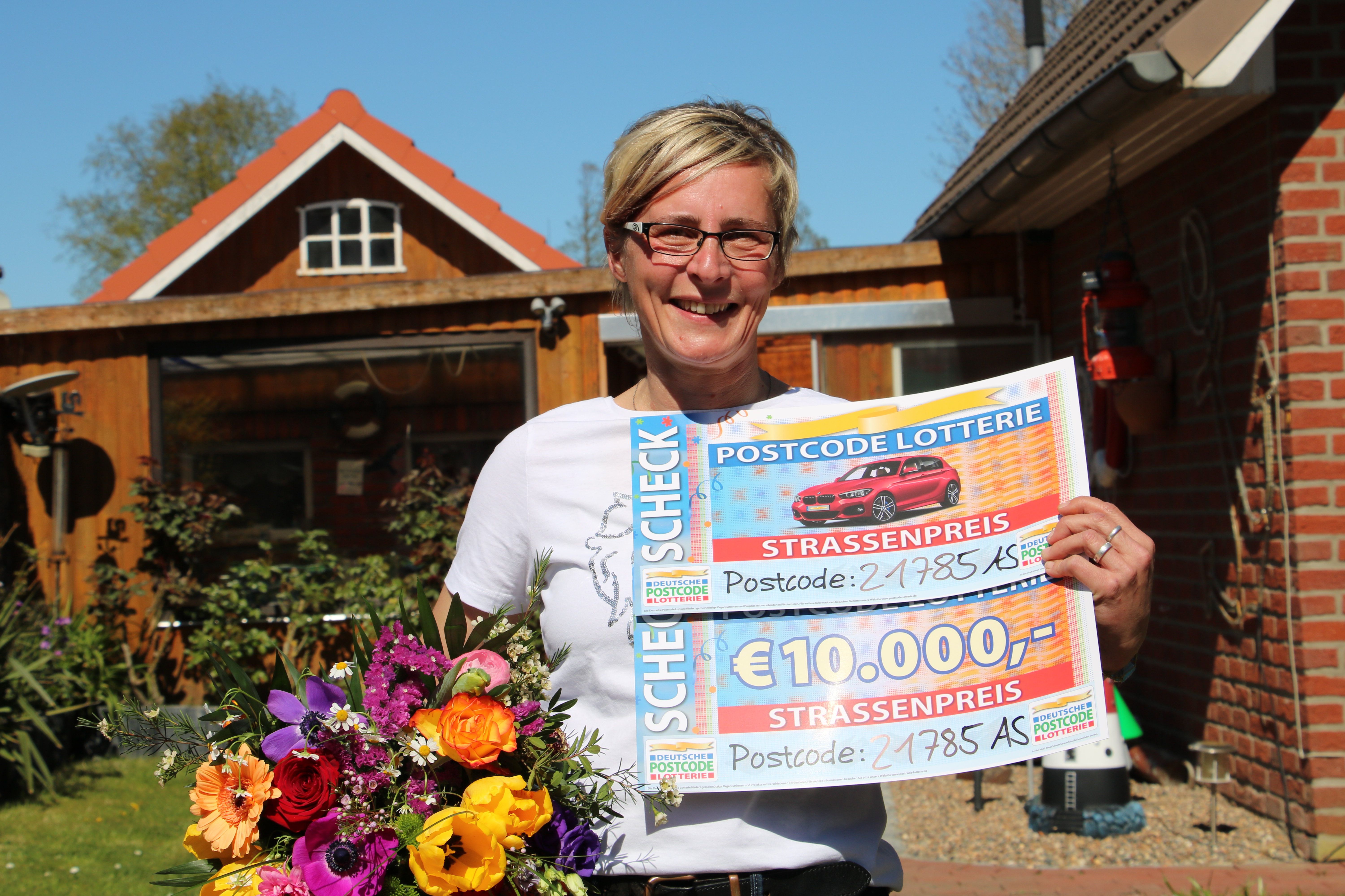 21785 AS lautet der Postcode, der für den vierten Straßenpreis im April bei der Deutschen Postcode Lotterie gezogen wurde. Er gehört zu der niedersächsischen Stadt Belum, in der Gewinnerin Maren gespannt auf die goldenen Überraschungsumschläge der Soziallotterie wartet. Vollkommen kontaktlos werden ihr die Blumen und zwei goldene Schecks vor die Tür gelegt, die sie voller Erwartung in Empfang nimmt.