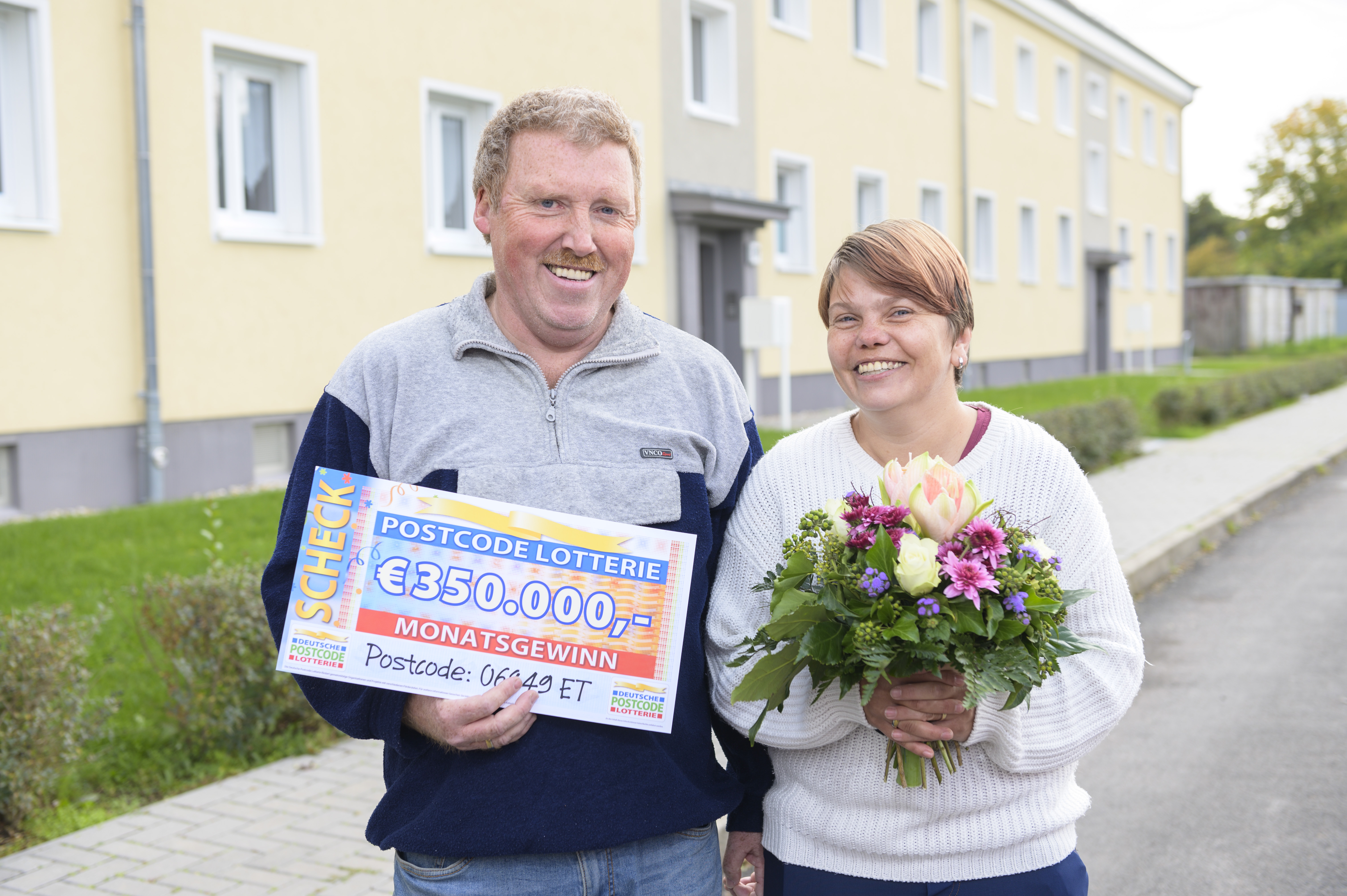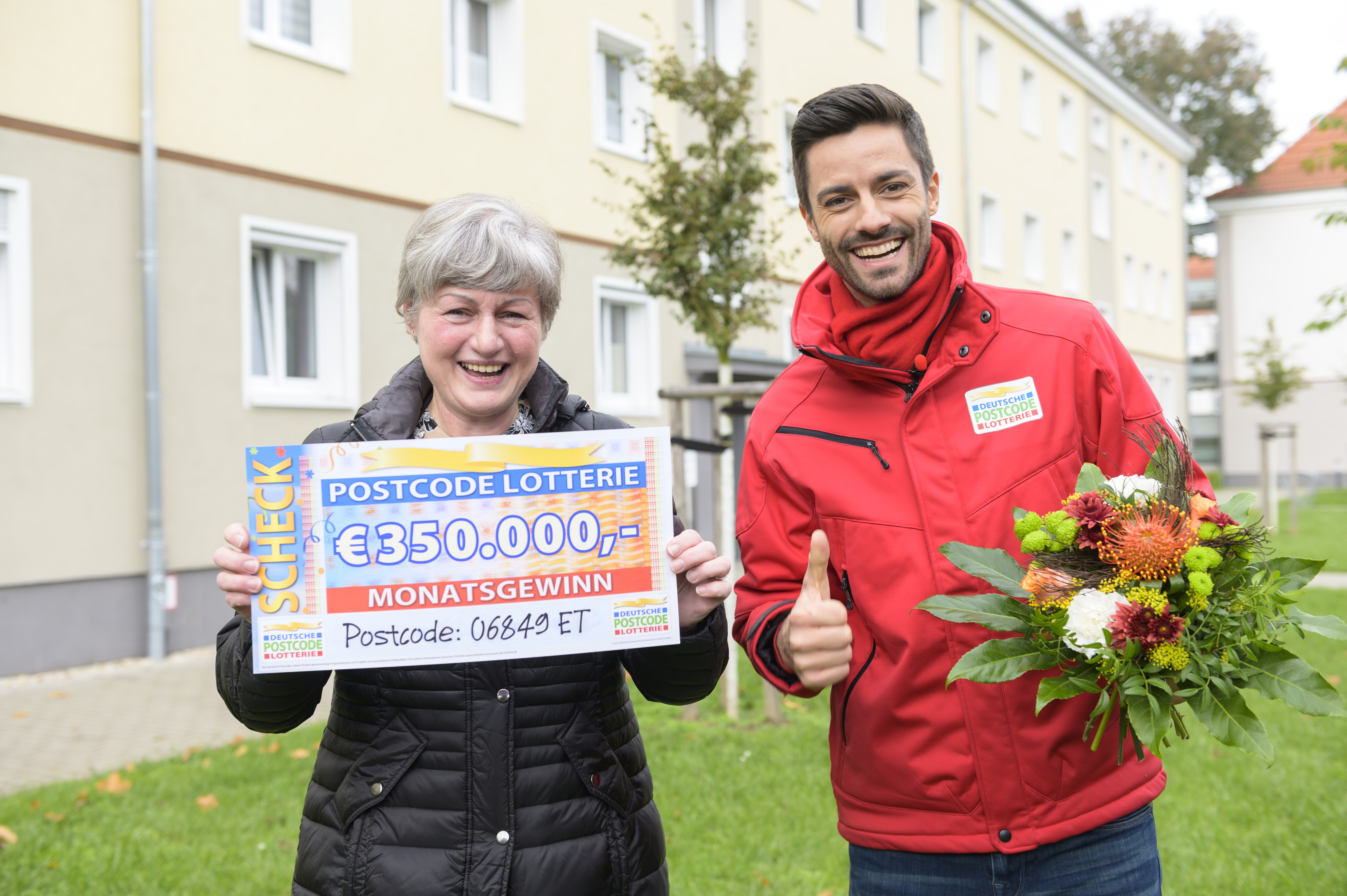 Dutzende Jubelschreie hört man am Samstag in Dessau-Roßlau in Sachsen-Anhalt. 117 Teilnehmer*innen der Deutschen Postcode Lotterie gewinnen dort insgesamt 1,4 Millionen Euro. Besonderen Grund zur Freude haben Marion* und Roland*: Dank des gezogenen Postcodes 06849 ET überrascht Glücksbote Giuliano Lenz die beiden Nachbarn mit Schecks über jeweils 350.000 Euro.