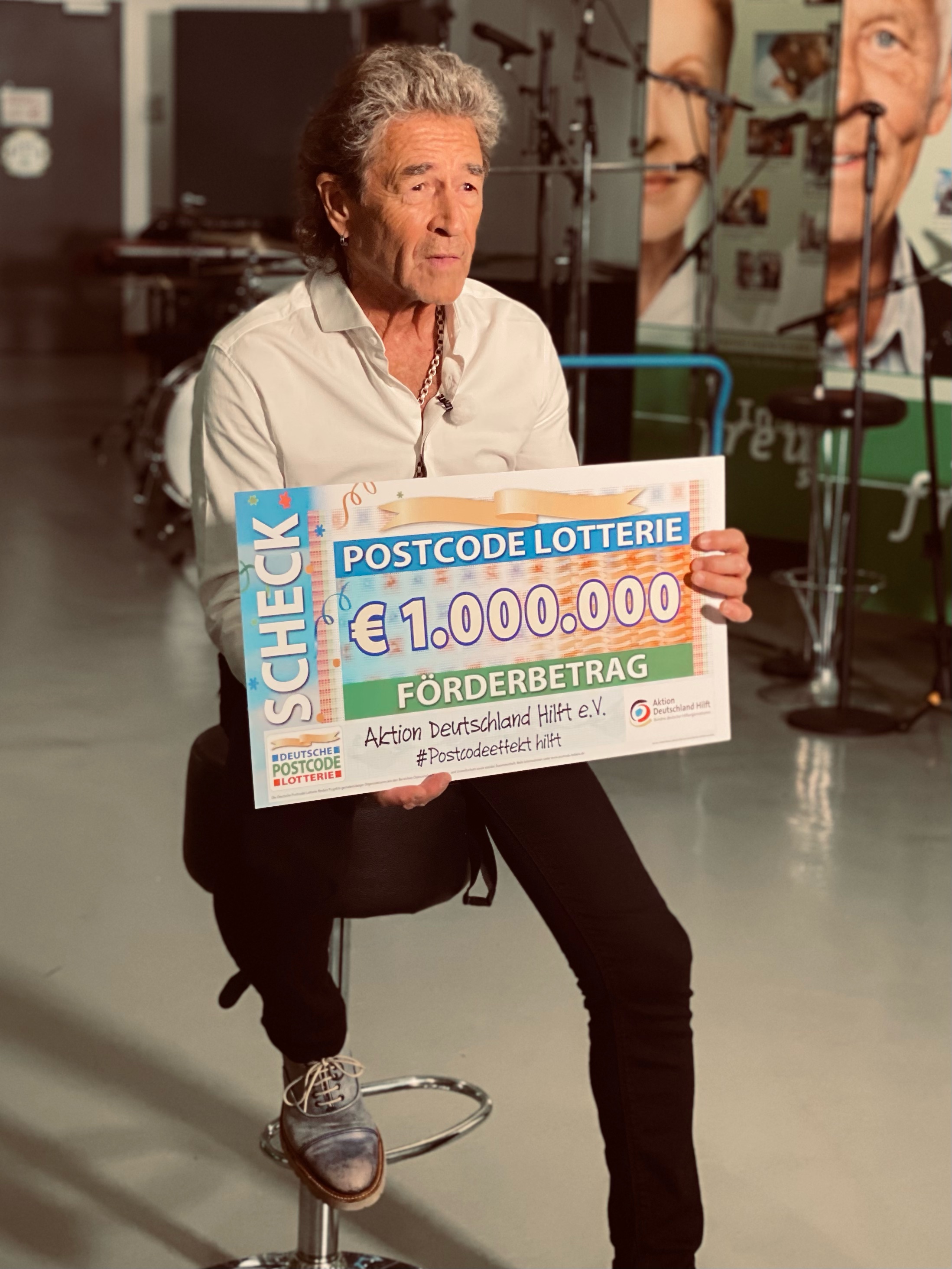 Im Namen der Teilnehmenden der Deutschen Postcode Lotterie überreichte Sänger Peter Maffay am Freitagabend bei einer ARD-Spendengala einen Scheck über eine Million Euro. Moderatorin Sarah von Neuburg nahm diesen für Aktion Deutschland Hilft entgegen. Das Bündnis deutscher Hilfsorganisationen arbeitet in den Katastrophengebieten schnell und effizient daran, Notversorgung anzubieten und Infrastrukturen wiederaufzubauen.