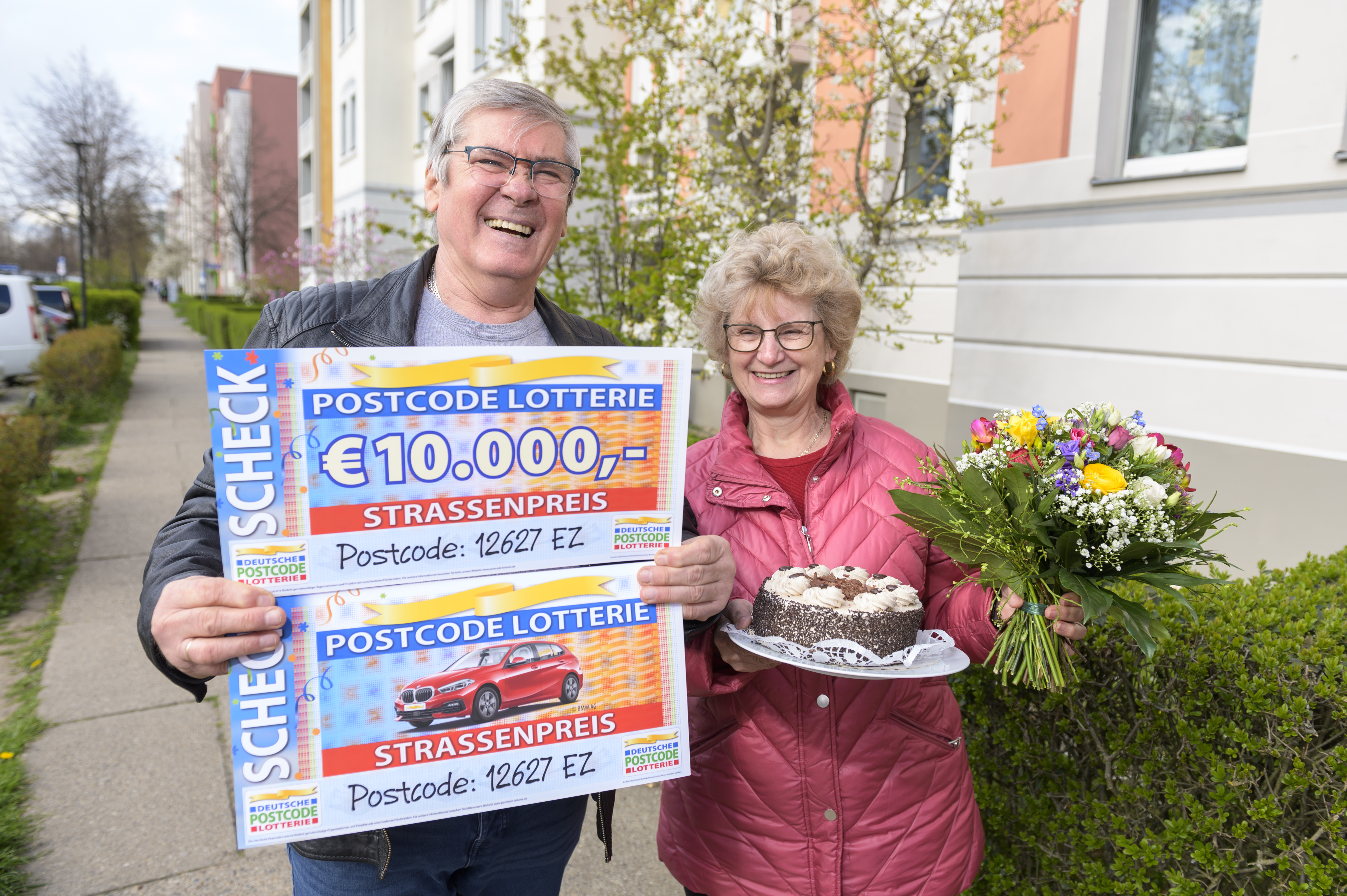 „Das ist ja fantastisch!“, jubelt Helmut, als Straßenpreis-Moderator Giuliano Lenz ihm die beiden großen Schecks überreicht. „Ich bin halt ein Sonntagskind!“, freut sich der frisch gebackene 71-Jährige. Und seine Frau Brigitte* ergänzt: „Dann können wir jetzt das Rentnerleben genießen.“ Das sympathische Ehepaar ist erst seit Kurzem gemeinsam im Ruhestand und freut sich riesig über die 10.000 Euro und den neuen BMW 1er. Das Los der Soziallotterie haben die beiden sich aber auch gekauft, weil sie damit soziale und grüne Projekte unterstützen: „Ich habe im Albert-Schweitzer-Kinderdorf in der Kita gearbeitet, das ist ja auch eine soziale Sache, darum haben wir jetzt ein Los der Deutschen Postcode Lotterie.“