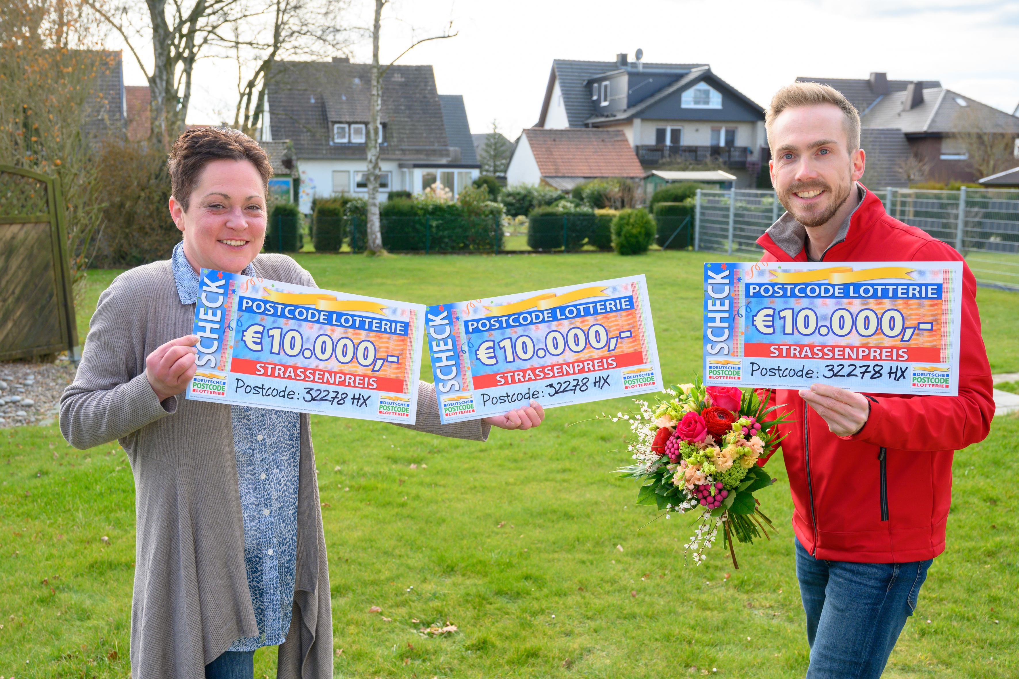 Riesenjubel über drei große Schecks in Kirchlengern: Der erste Straßenpreis der Deutschen Postcode Lotterie im März geht an die Kleinstadt im Nordosten von Nordrhein-Westfalen. Dank des gezogenen Postcodes 32278 HX freut sich Svenja* über insgesamt 30.000 Euro. Von dem Gewinn möchte sich die 42-Jährige einen Traum erfüllen.