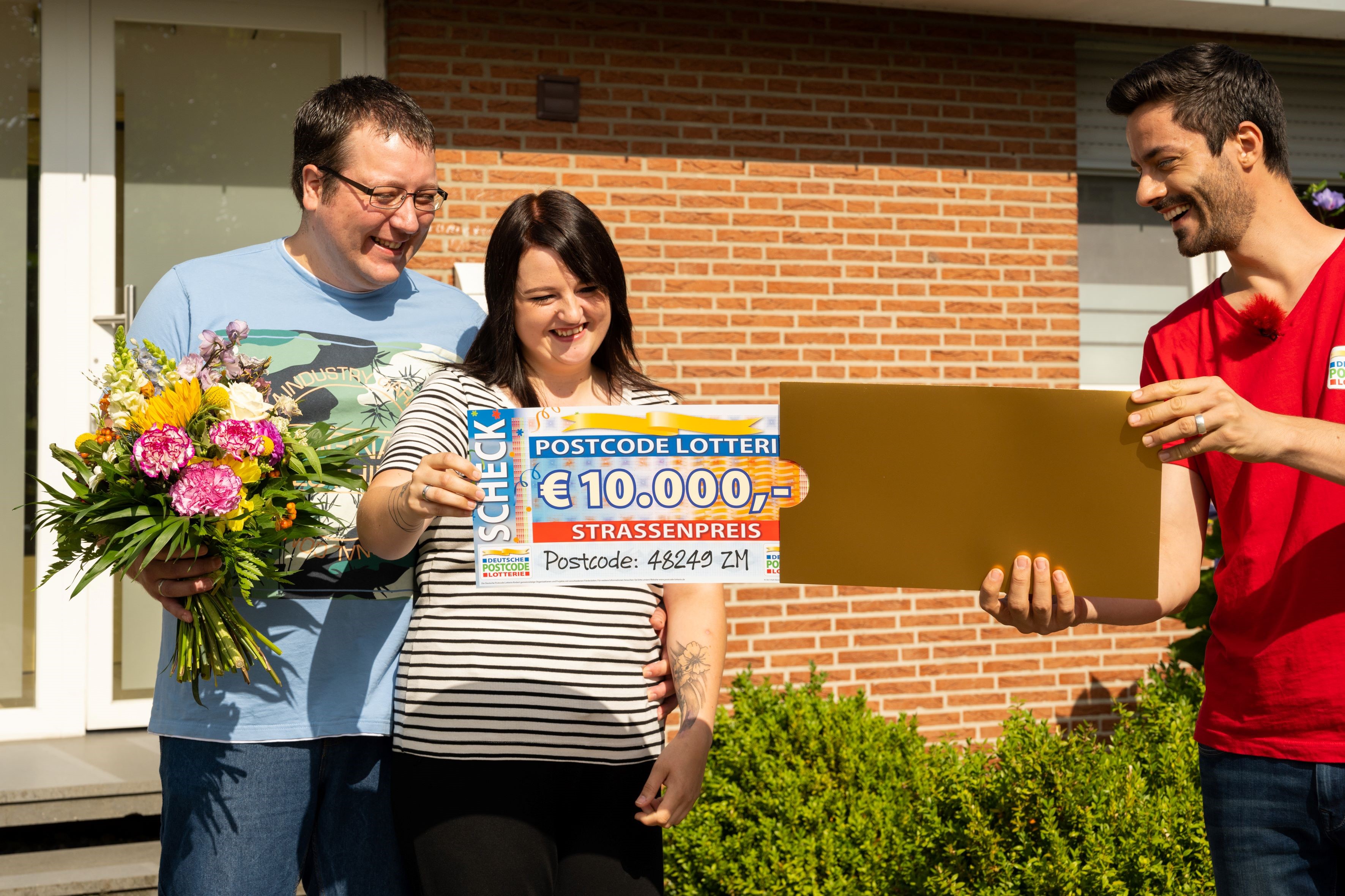 Patricks Nachbarn feierten ebenfalls mit, denn Straßenpreis-Moderator Giuliano Lenz besuchte auch Sabrina* und Markus*. Markus besitzt ein Los der Deutschen Postcode Lotterie. Als seine Frau Sabrina den symbolischen Scheck über 10.000 Euro aus dem goldenen Umschlag zog, brach es aus ihr heraus. „Mein Mann macht gerade eine berufliche Umschulung. Das Geld können wir da wirklich gut gebrauchen.“