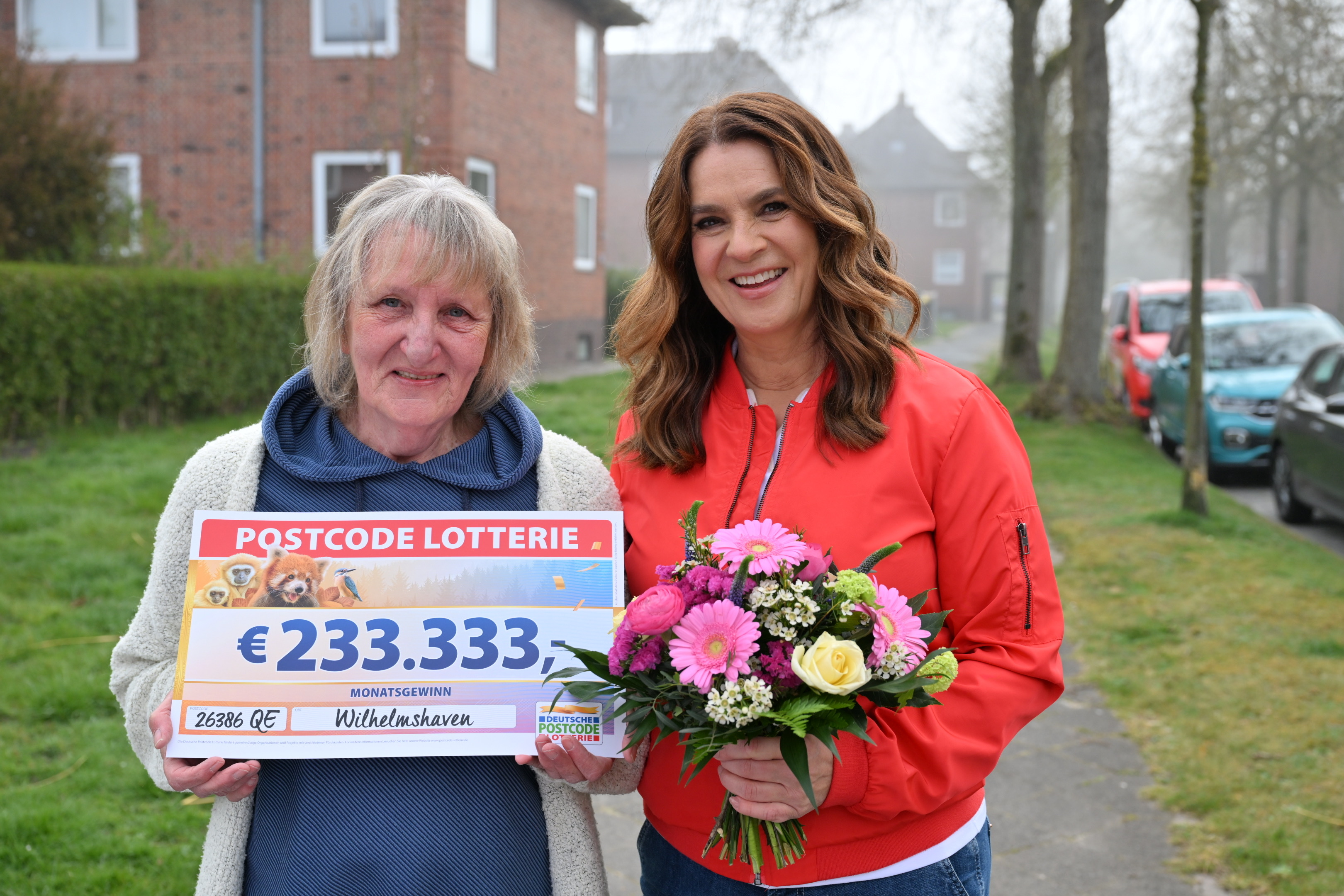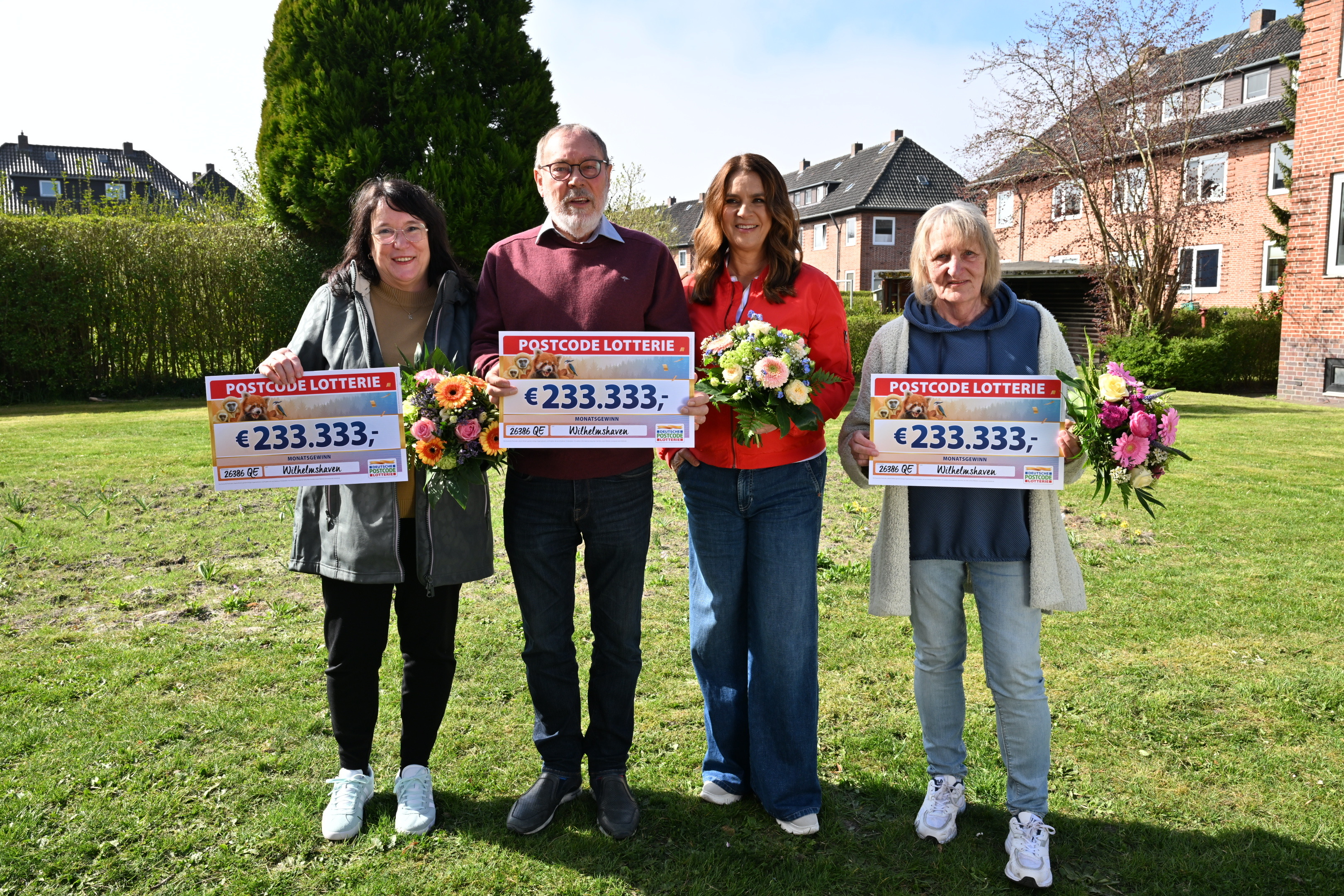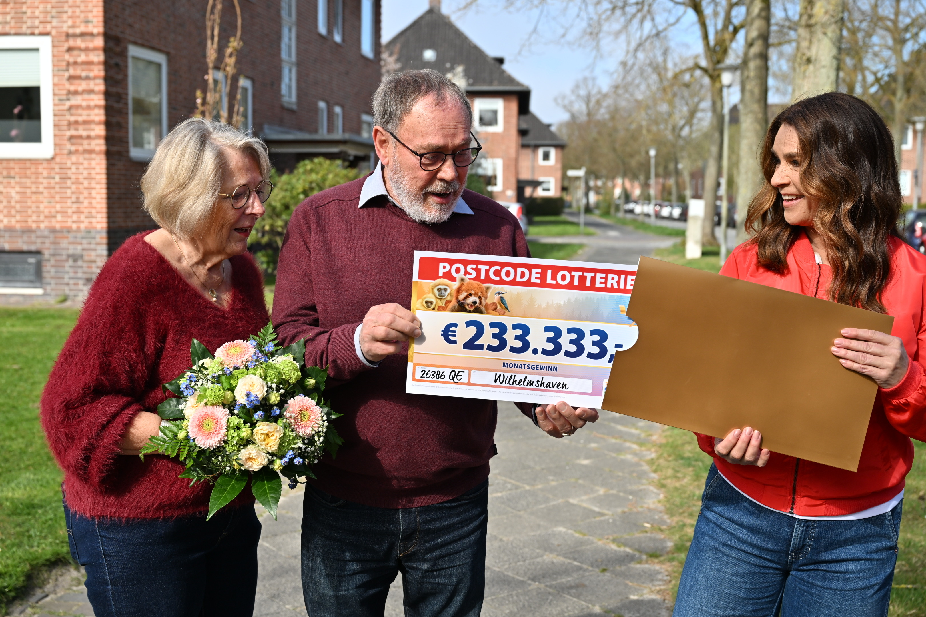 Lotterie-Wahnsinn in Wilhelmshaven: 385 Gewinner*innen mit 506 Losen freuen sich über den April-Monatsgewinn der Deutschen Postcode Lotterie in Höhe von 1,4 Millionen Euro. Besonderen Grund zur Freude hatten dabei gleich drei Nachbar*innen – dank ihres gezogenen Postcodes 26386 QE gewinnen sie zusammen 700.000 Euro. Lotterie-Botschafterin Katarina Witt hat die drei Glückspilze und alle weiteren Gewinner*innen persönlich überrascht. Und auch der gute Zweck gewinnt immer mit, denn dank aller Teilnehmer*innen in Wilhelmshaven und ganz Niedersachsen konnte die Deutsche Postcode Lotterie in dem Bundesland bereits 613 soziale und grüne Projekte von gemeinnützigen Organisationen mit über 31 Millionen Euro fördern. Darunter auch Greenpeace – die Organisation erhielt vor Ort einen symbolischen Förderscheck in Höhe von zwei Millionen Euro für den Schutz unserer Wälder.