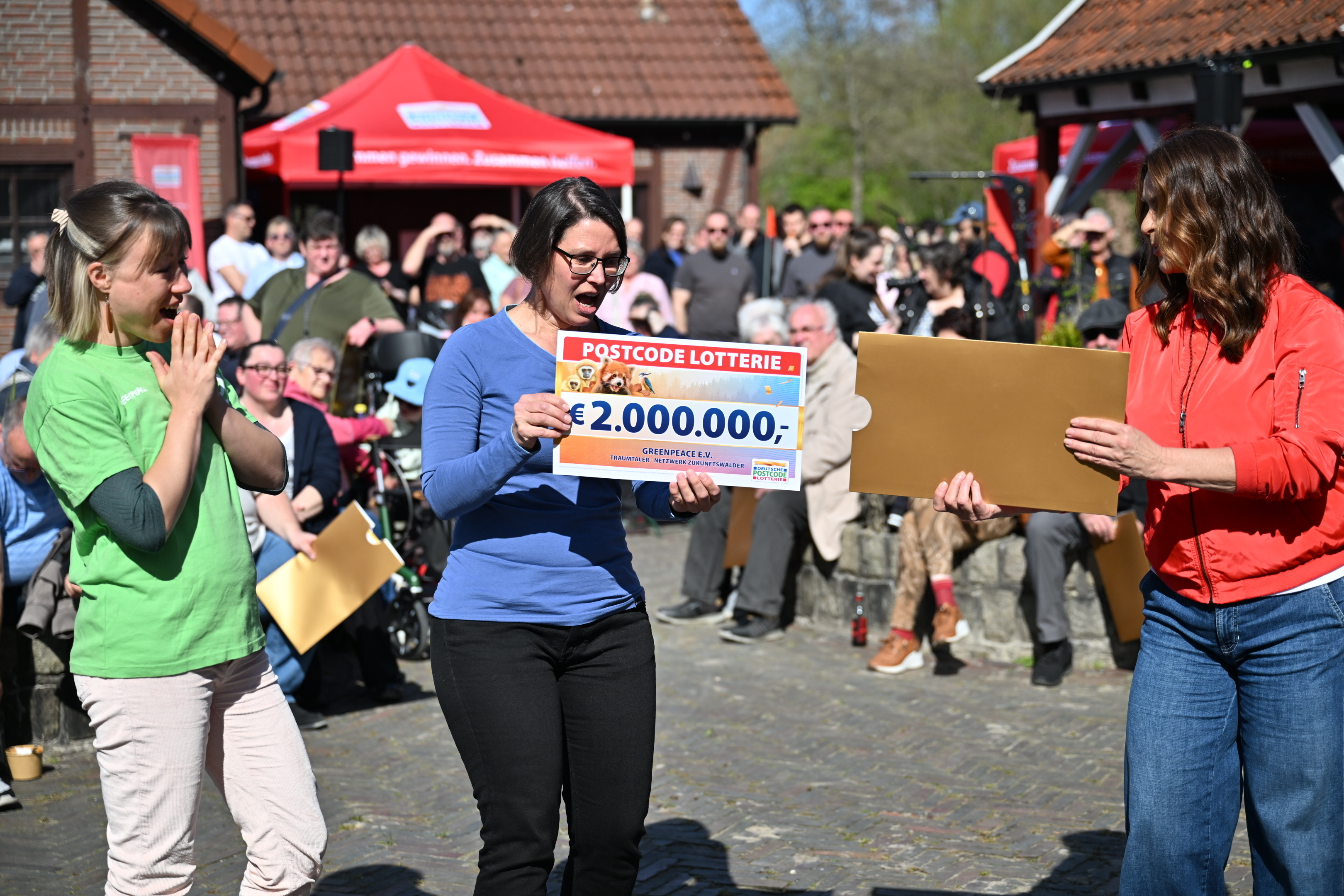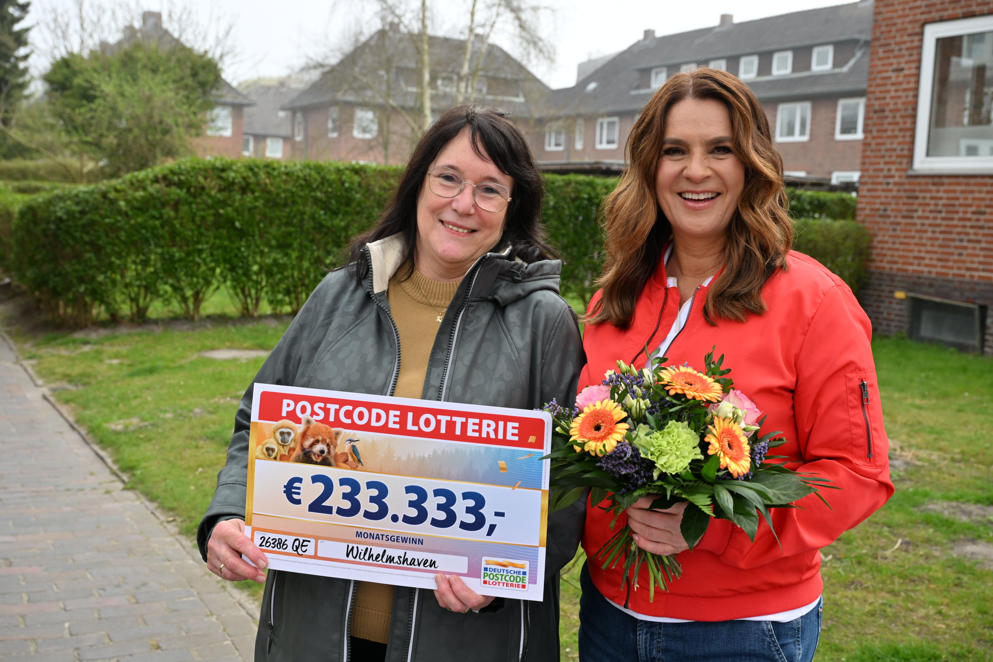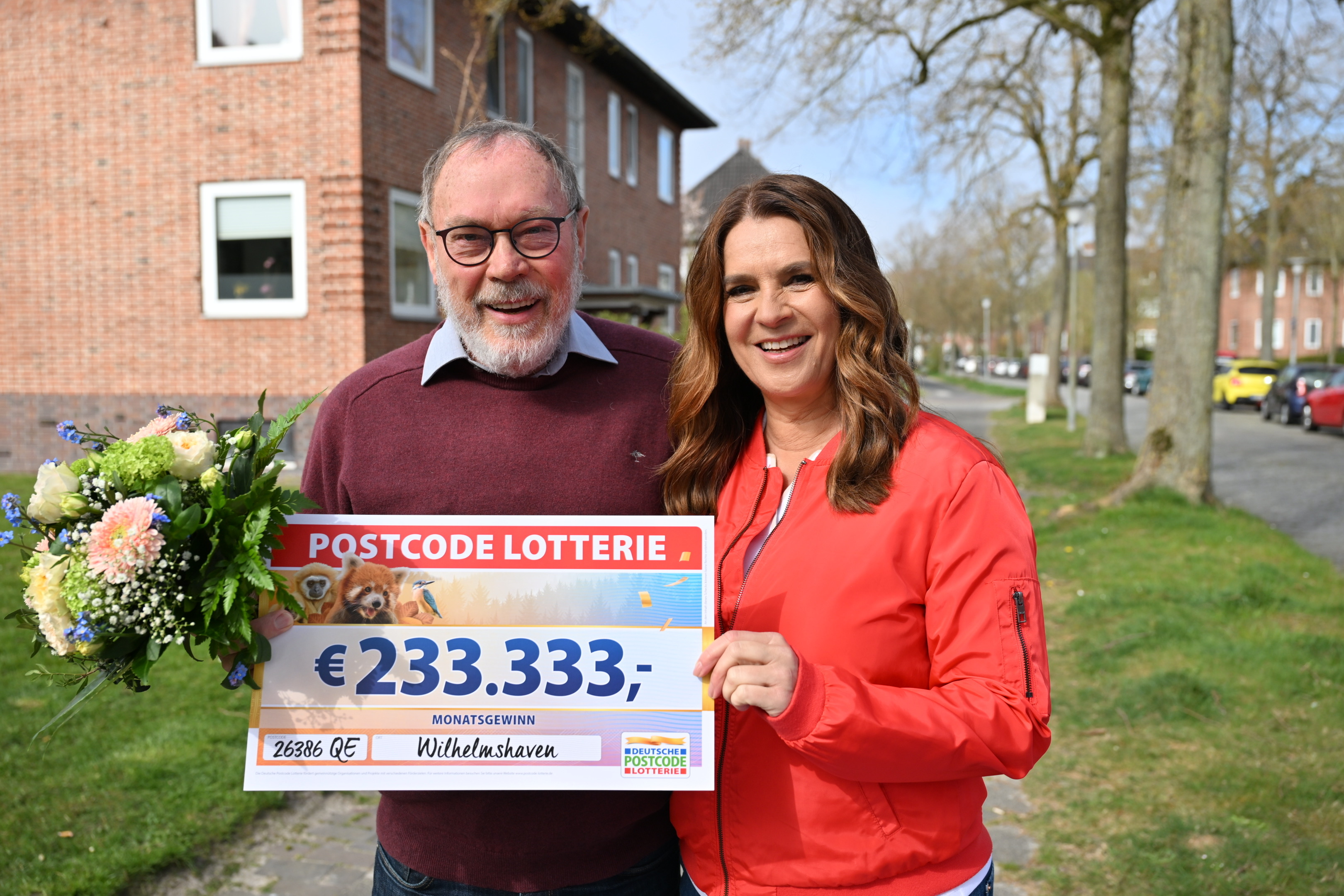 Lotterie-Wahnsinn in Wilhelmshaven: 385 Gewinner*innen mit 506 Losen freuen sich über den April-Monatsgewinn der Deutschen Postcode Lotterie in Höhe von 1,4 Millionen Euro. Besonderen Grund zur Freude hatten dabei gleich drei Nachbar*innen – dank ihres gezogenen Postcodes 26386 QE gewinnen sie zusammen 700.000 Euro. Lotterie-Botschafterin Katarina Witt hat die drei Glückspilze und alle weiteren Gewinner*innen persönlich überrascht. Und auch der gute Zweck gewinnt immer mit, denn dank aller Teilnehmer*innen in Wilhelmshaven und ganz Niedersachsen konnte die Deutsche Postcode Lotterie in dem Bundesland bereits 613 soziale und grüne Projekte von gemeinnützigen Organisationen mit über 31 Millionen Euro fördern. Darunter auch Greenpeace – die Organisation erhielt vor Ort einen symbolischen Förderscheck in Höhe von zwei Millionen Euro für den Schutz unserer Wälder.