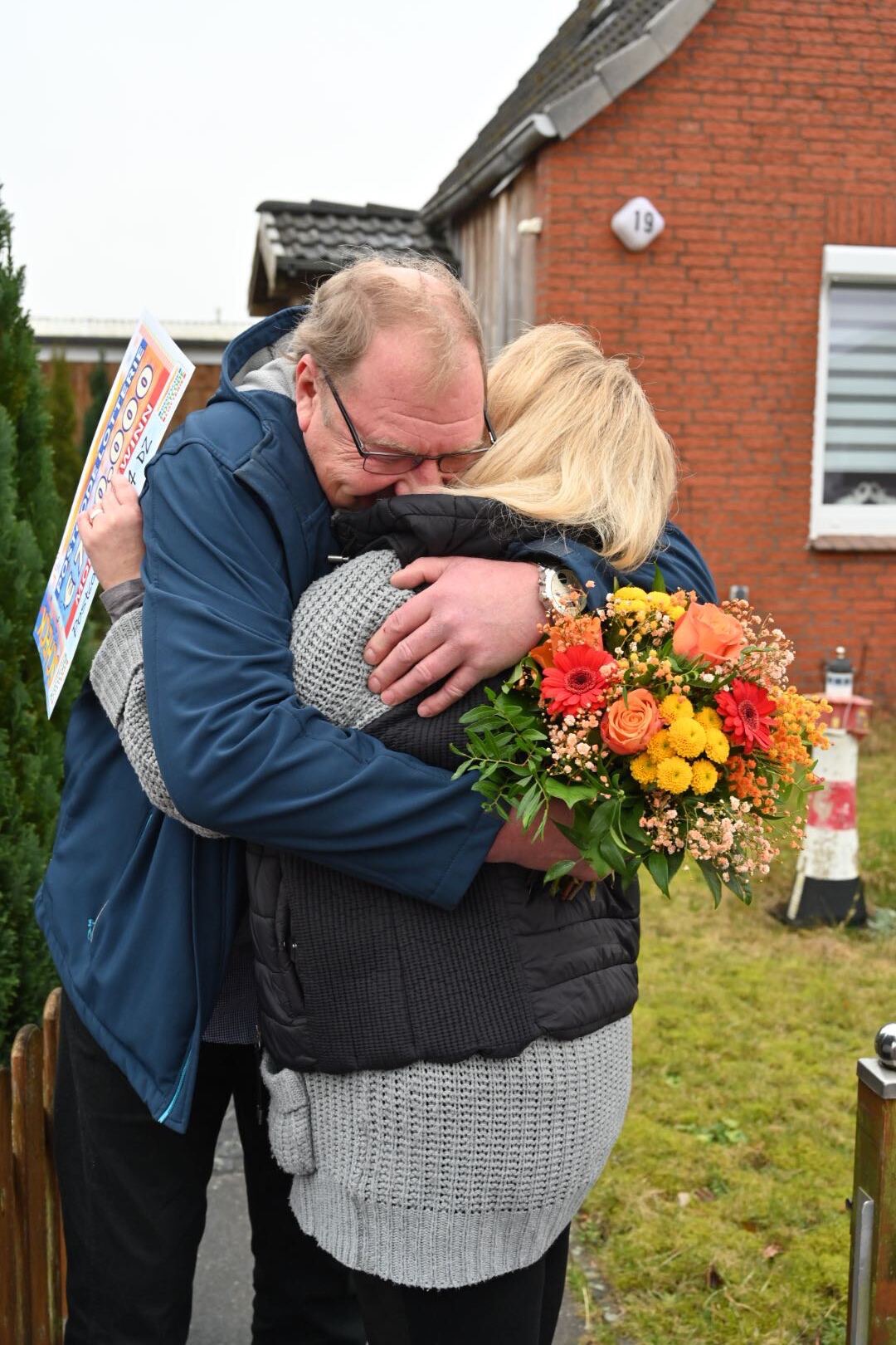 Als Glücksbote Felix Uhlig an Michaelas Haustür klingelt, nimmt sie mit zittrigen Händen den großen, goldenen Umschlag entgegen. „Ich bin so aufgeregt“, sagt die 56-Jährige und wird dabei von ihrem Ehemann Matthias* gestützt. Als sie den Scheck herauszieht und die Summe liest, entfährt es ihr mit Tränen in den Augen: „700.000 Euro?! Ich muss mich erst einmal setzen und das sacken lassen.“ Beim anschließenden Gewinnerfest, bei dem sich auf dem Sportplatz in Westerrönfeld zahlreiche der weiteren Gewinner*innen versammeln, berichtet Michaela von ihrem großen Wunsch: „Seit meinen Jugendjahren träume ich davon, eine große Irland-Rundreise zu machen. Das werde ich nun definitiv realisieren“, sagt sie und umarmt dabei Ehemann Matthias.