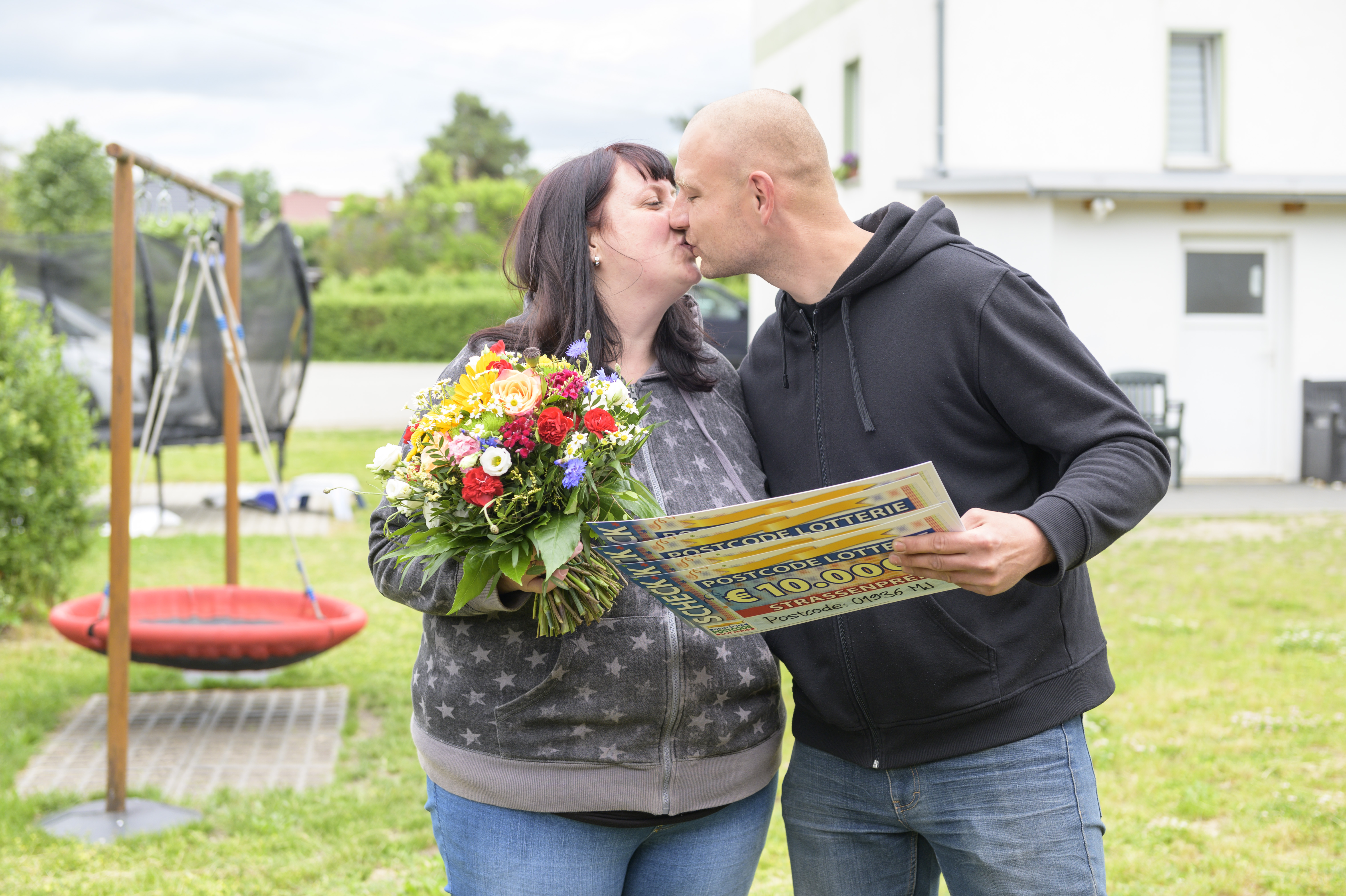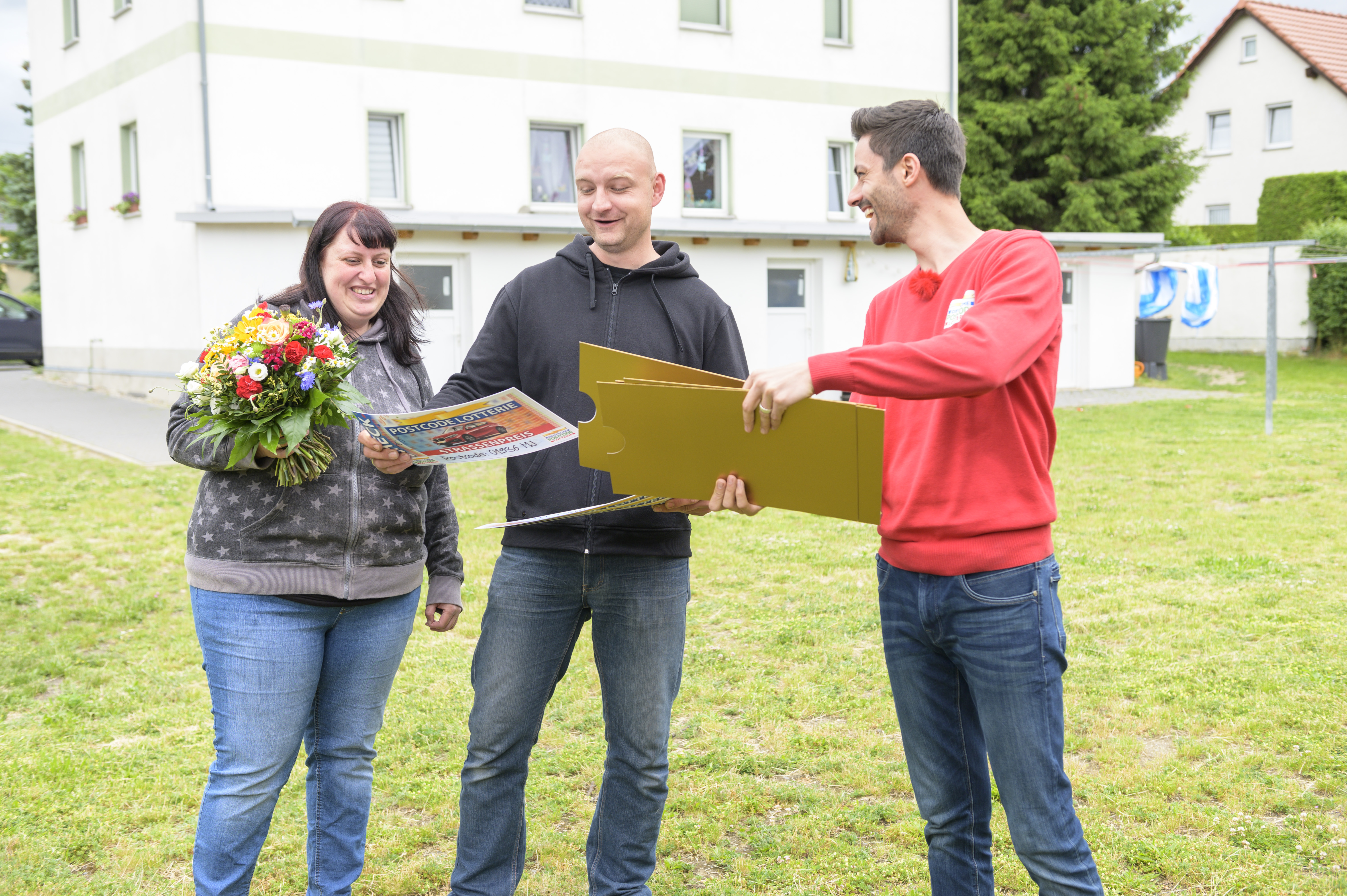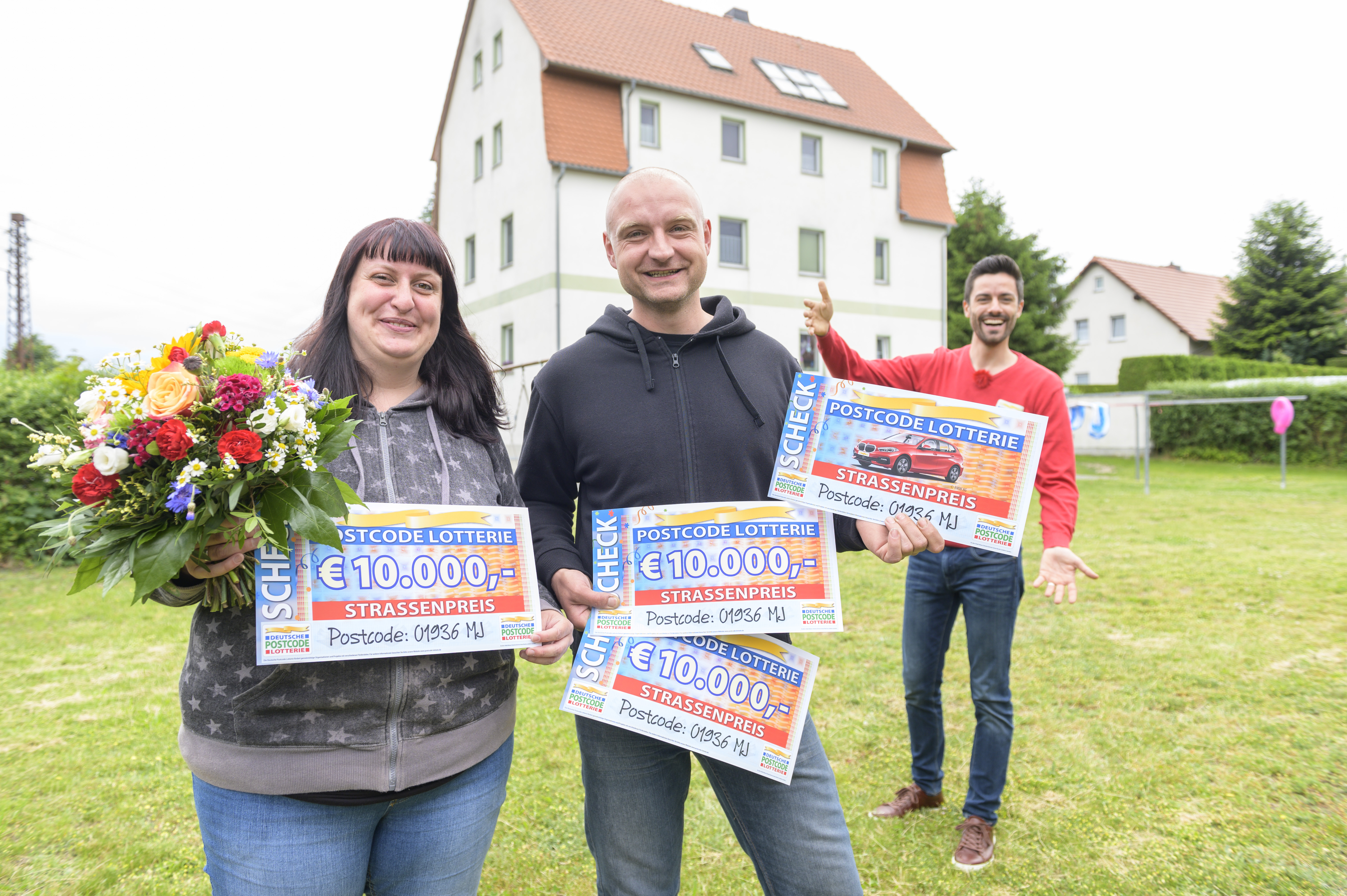Vier goldene Umschläge präsentiert Straßenpreis-Moderator Giuliano Lenz dem aufgeregten Michael aus Schwepnitz. Ganz langsam zieht der Sachse einen Scheck nach dem anderen hervor. Der Stahlbauer besitzt drei Lose, darum gewinnt er mit den ersten drei Schecks jeweils 10.000 Euro. Da sein Postcode beim vierten Straßenpreis des Monats gezogen wurde, erblickt der 34-Jährige auf dem letzten Scheck zusätzlich noch einen BMW 1er und fällt seiner Frau Kathrin jubelnd um den Hals: „Ich bin sprachlos und überglücklich. Ich kann es noch gar nicht fassen!“ Michael spielt erst seit November bei der Soziallotterie mit. „Und schon jetzt klingelt es in der Kasse. Damit hätte ich definitiv nicht gerechnet!“