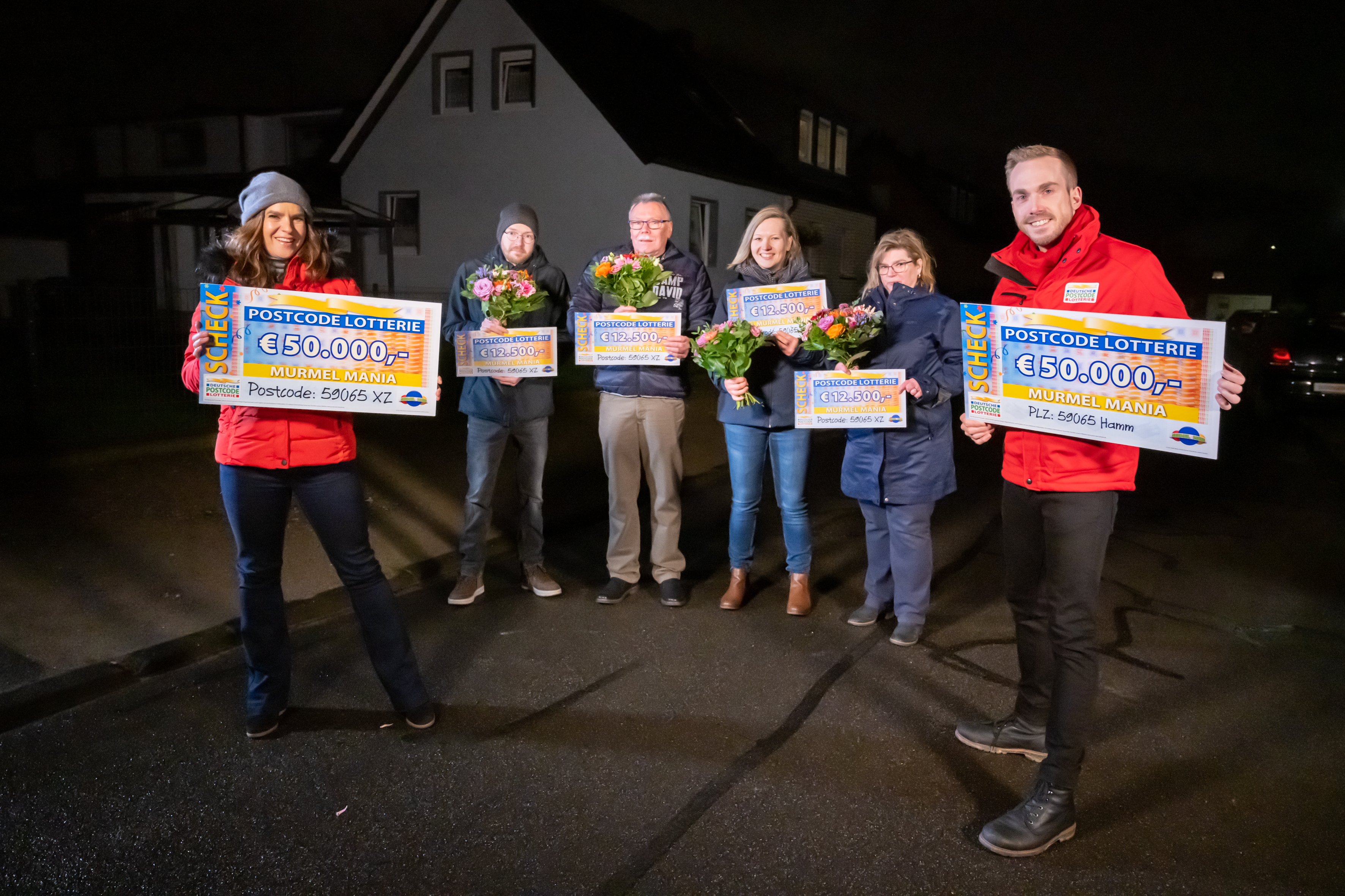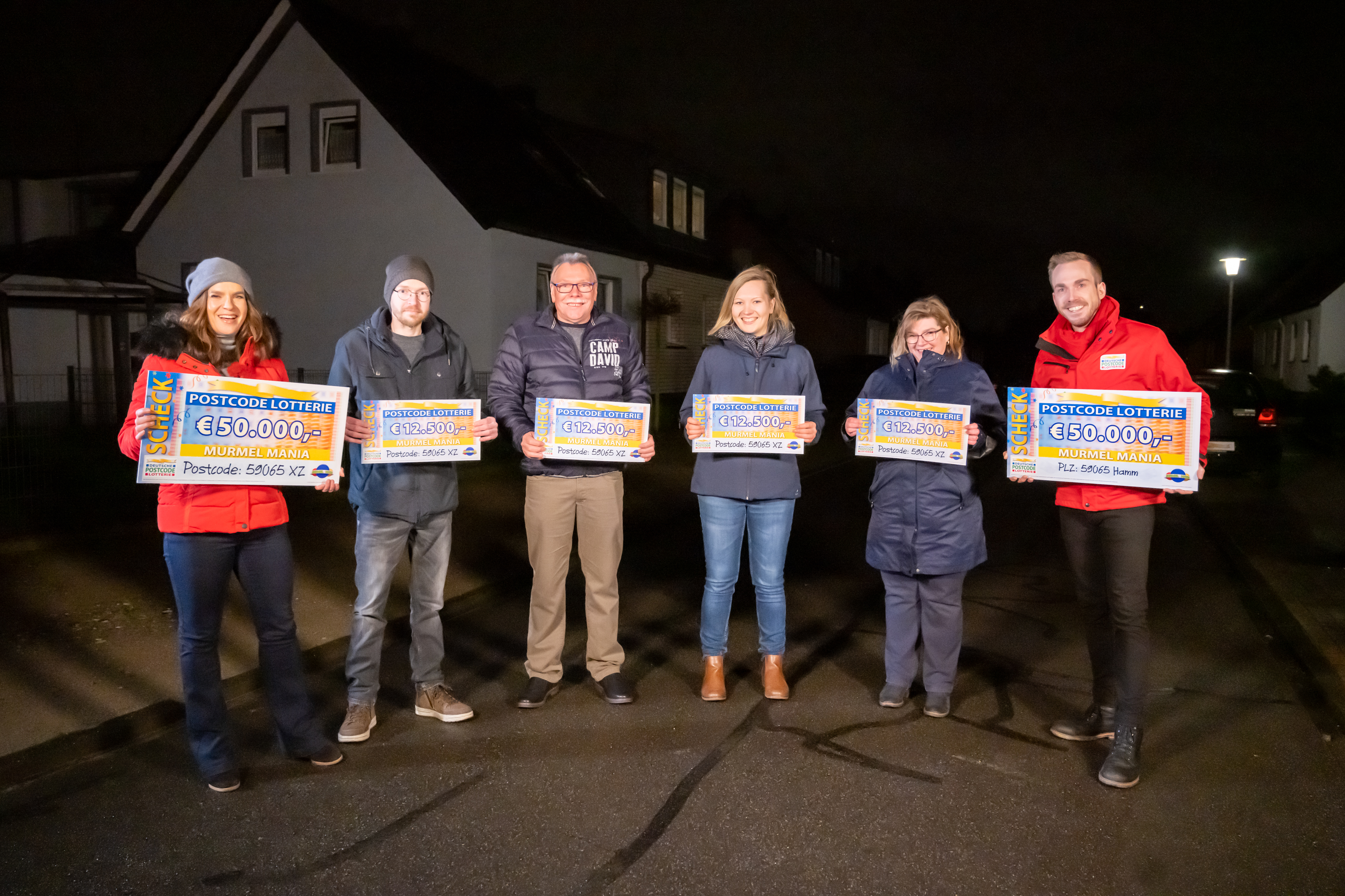 Vier Nachbar*innen aus Hamm gewannen in der gestrigen TV-Sendung „Murmel Mania“ zusammen 50.000 Euro. Diesen unerwarteten Geldsegen bescherten ihnen ihre Lose der Deutschen Postcode Lotterie sowie eine gelbe Murmel, die in der Finalrunde als Erste ins Ziel rollte – die Farbe Gelb war in der Show genau ihrem Postcode zugeordnet. Katarina Witt, zweifache Olympiasiegerin im Eiskunstlauf und internationale Botschafterin der Postcode Lotterie, überraschte die Glückspilze mit ihren Gewinnschecks persönlich. Stolze 12.500 Euro pro Person – das bedeutet, dass sich der Losbeitrag der Teilnehmer*innen als Gewinn vertausendfacht hat. Der Postcode 59065 XZ bescherte aber nicht nur den vier Nachbar*innen Glück. Weitere 50.000 Euro teilten sich 176 Losbesitzer*innen mit der Postleitzahl 59065.