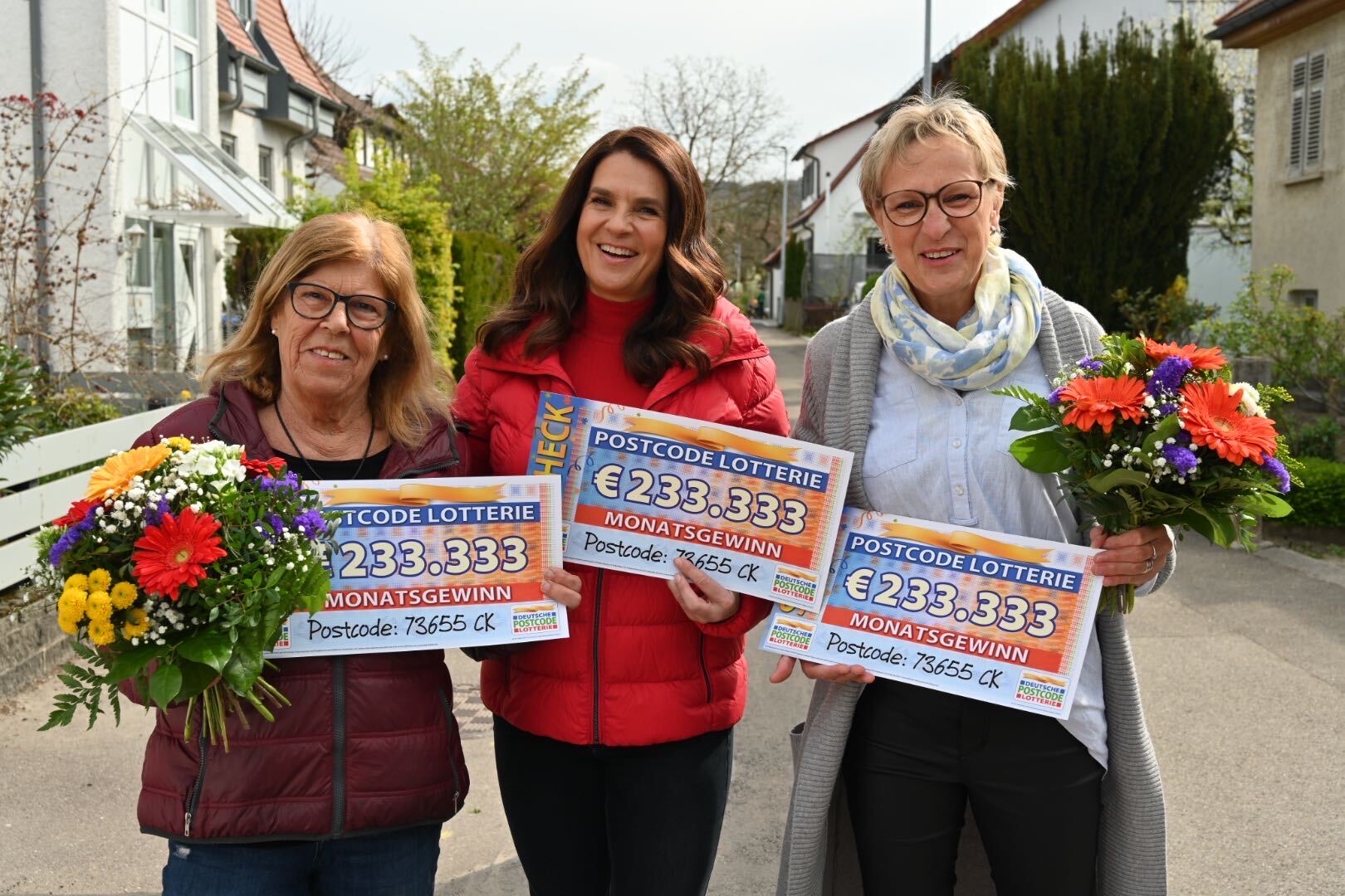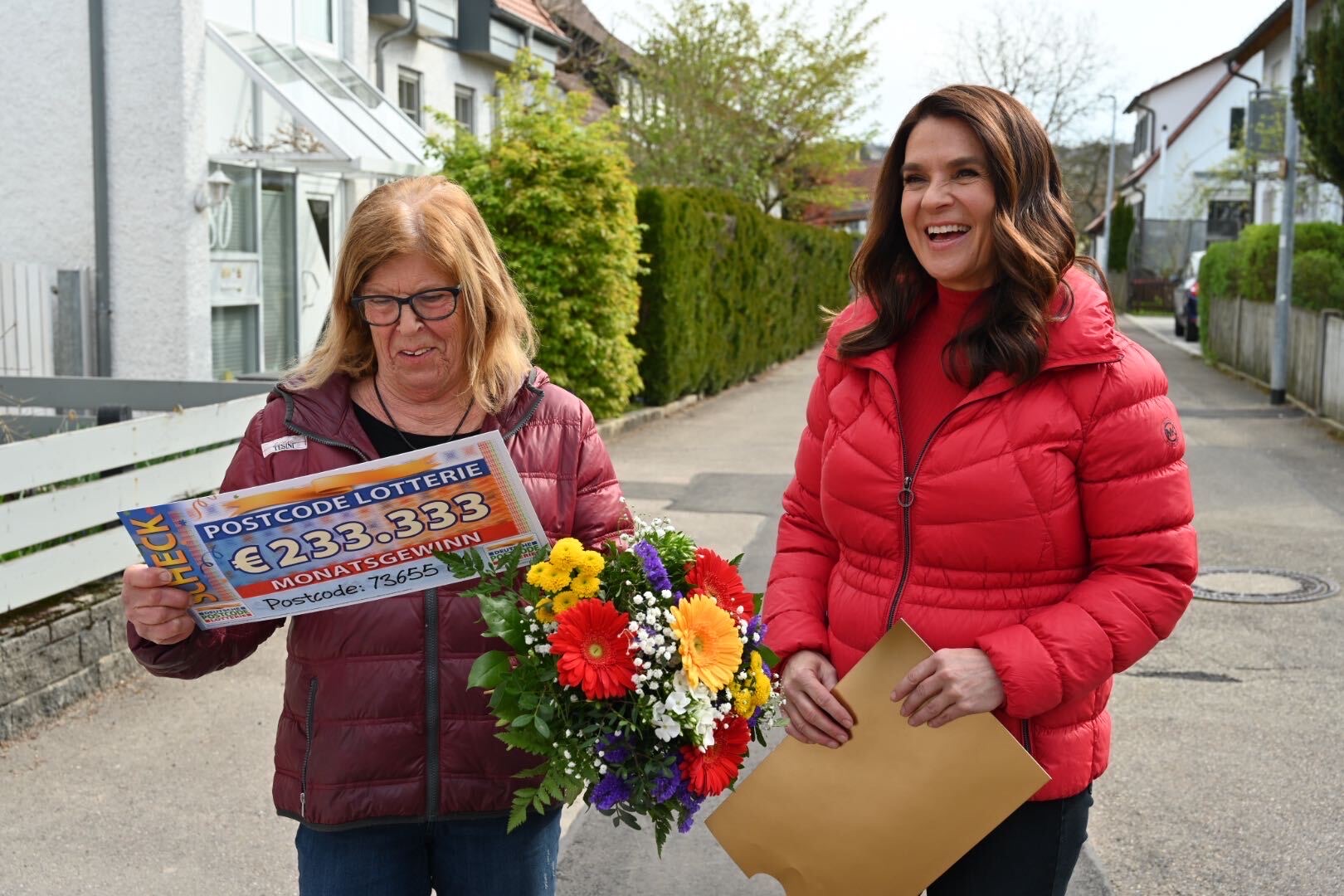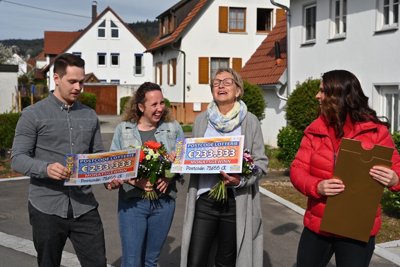 Diesen Samstagmittag werden Sabine* und Susanne* so schnell nicht vergessen: Die beiden Nachbarinnen bekommen dank ihres gezogenen Postcodes 73655 CK und je eines Loses von Lotterie-Botschafterin Katarina Witt persönlich einen Scheck überreicht und erfahren ihre Gewinnsumme: jeweils 233.333 Euro! „Du auch?“, sagt Sabine ungläubig und umarmt mit Freudentränen in den Augen ihre Nachbarin, die sie seit Kindheitstagen kennt und nur wenige Häuser entfernt wohnt. Auch Sabines Ehemann hat Glück und gewinnt dank eines Loses ebenfalls 233.333 Euro. Für den dritten Postcode-Monatsgewinner nehmen seine Kinder Adrian* und Lisa* stellvertretend den Scheck entgegen.