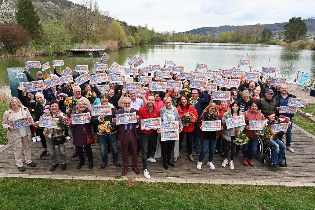 Während sich die drei Postcode-Gewinner über die erste Hälfte der 1,4 Millionen Euro freuen, teilen sich 116 weitere Glückspilze mit insgesamt 173 Losen in der Postleitzahl 73655 ebenfalls 700.000 Euro, 4.046 Euro pro Los entspricht. Da einige der Glücklichen nicht nur ein Lotterie-Los, sondern zwei oder gar drei besitzen, gewinnen sie auch die doppelte bzw. dreifache Summe. 29 Gewinner*innen dürfen sich somit über 8.092 Euro freuen, 14 sogar über 12.138 Euro. Bei der großen Scheck-Überraschung am Plüderhäuser Badesee feiern alle Gewinner*innen zusammen mit ihren Angehörigen, Lotterie-Botschafterin Katarina Witt und dem Team der Deutschen Postcode Lotterie den Monatsgewinn. Auch Bürgermeister Benjamin Treiber hat es sich nicht nehmen lassen, vor Ort zu sein und zu gratulieren.