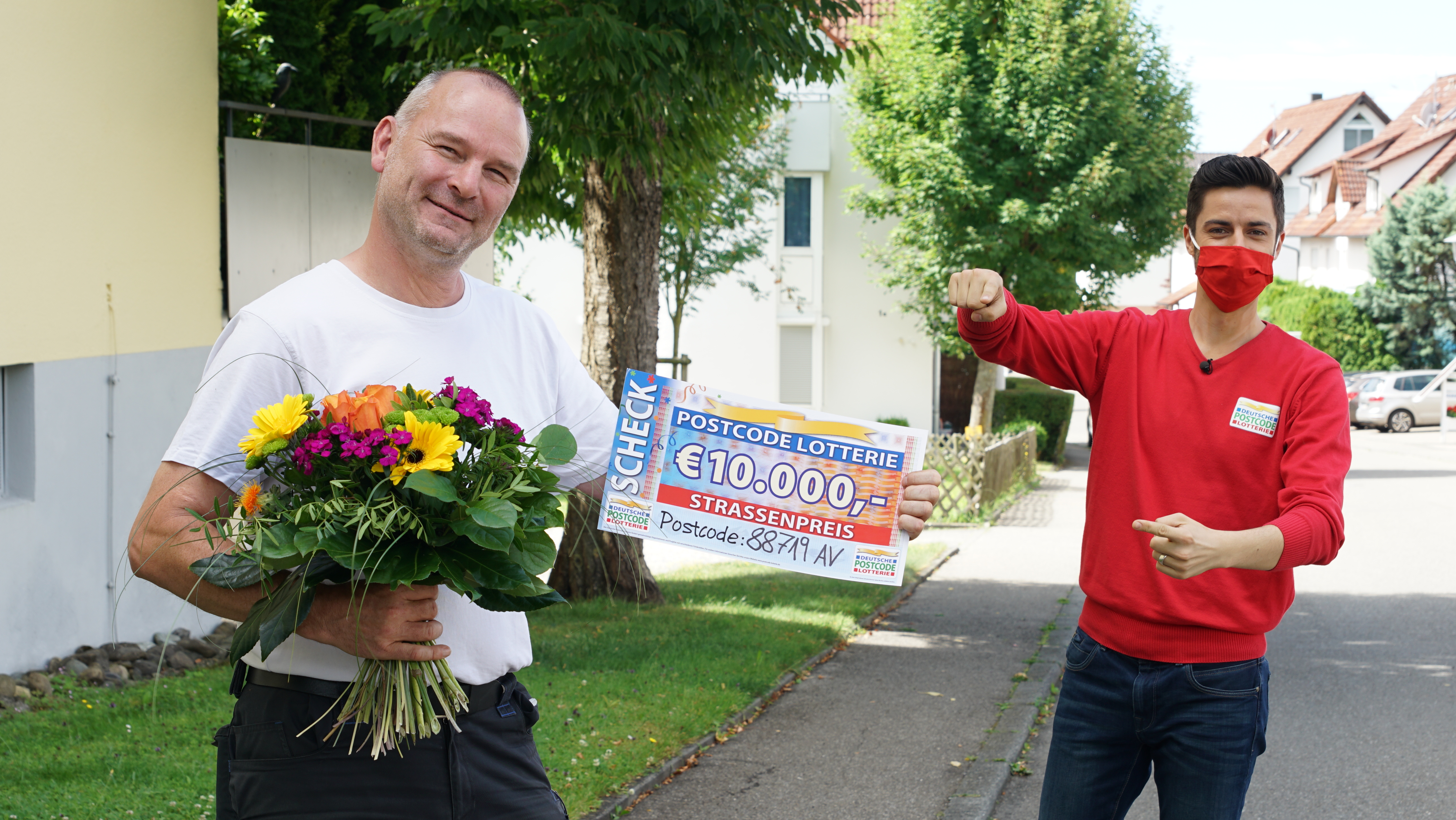 Der dritte Juli-Straßenpreis der Deutschen Postcode Lotterie geht nach Stetten in Baden-Württemberg. In der kleinsten eigenständigen Gemeinde im Bodenseekreis leben knapp 1.000 Einwohner. Einer davon ist Tobias*, der dank seines gezogenen Postcodes 88719 AV von Straßenpreis-Moderator Giuliano Lenz mit einem 10.000-Euro-Scheck überrascht wird. Mit seinem Los unterstützt er soziale und grüne Projekte in der Nähe.