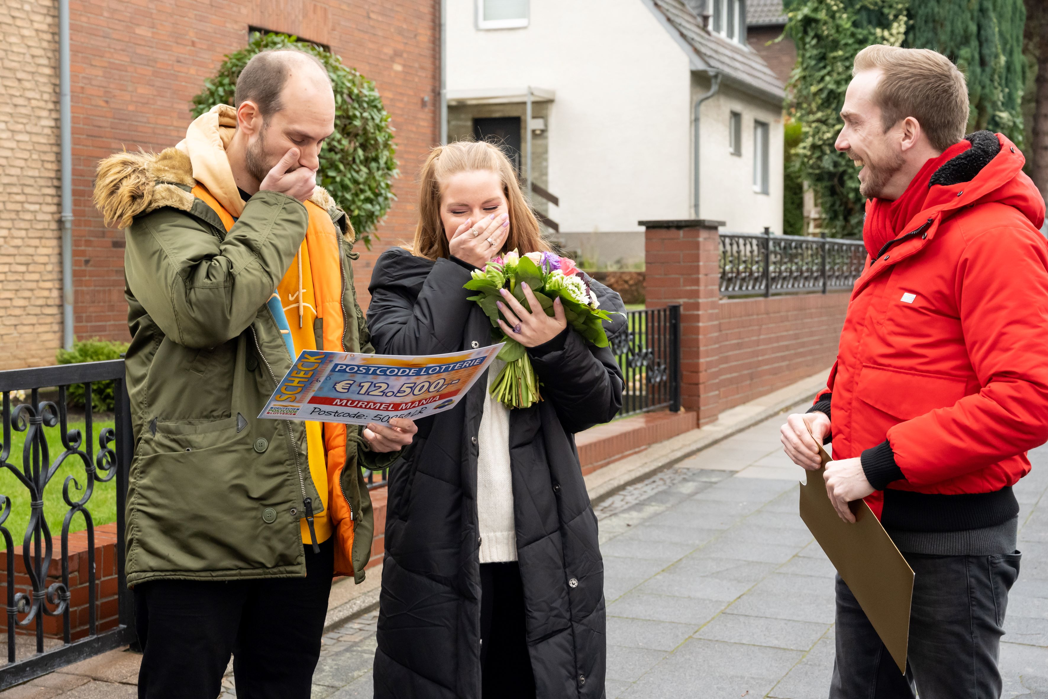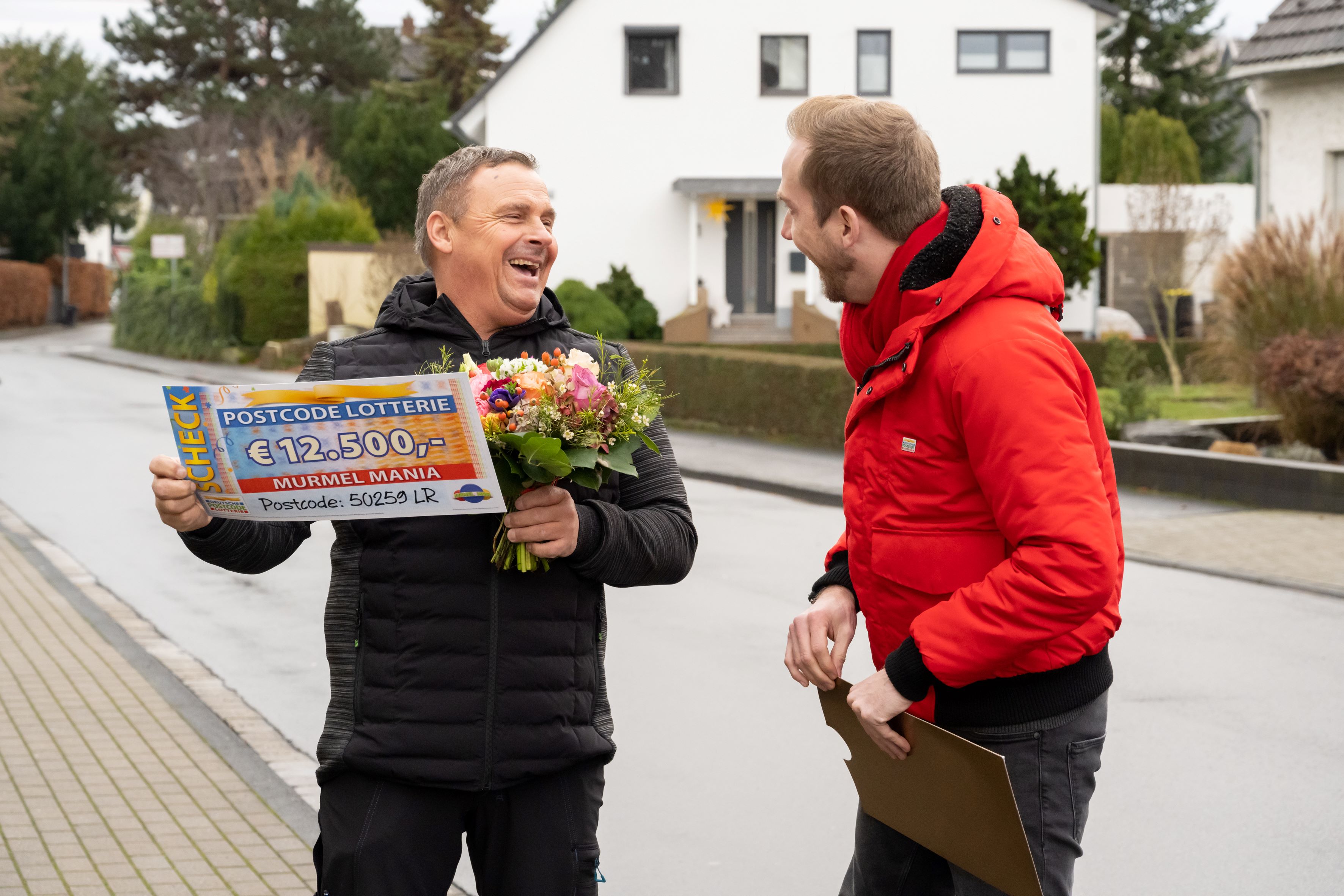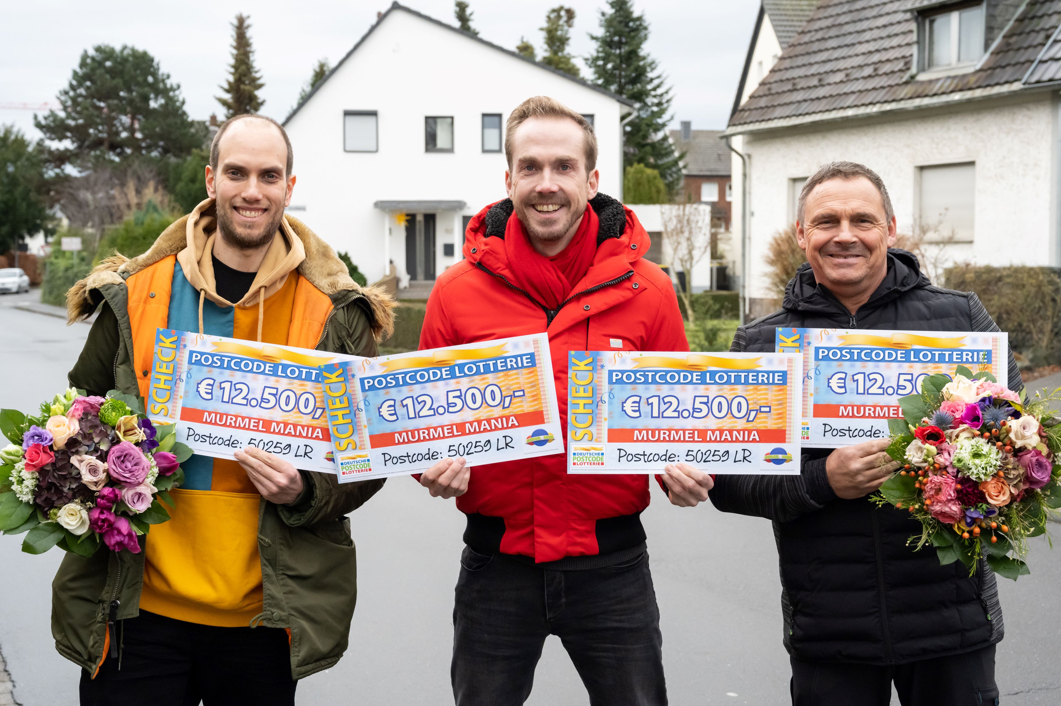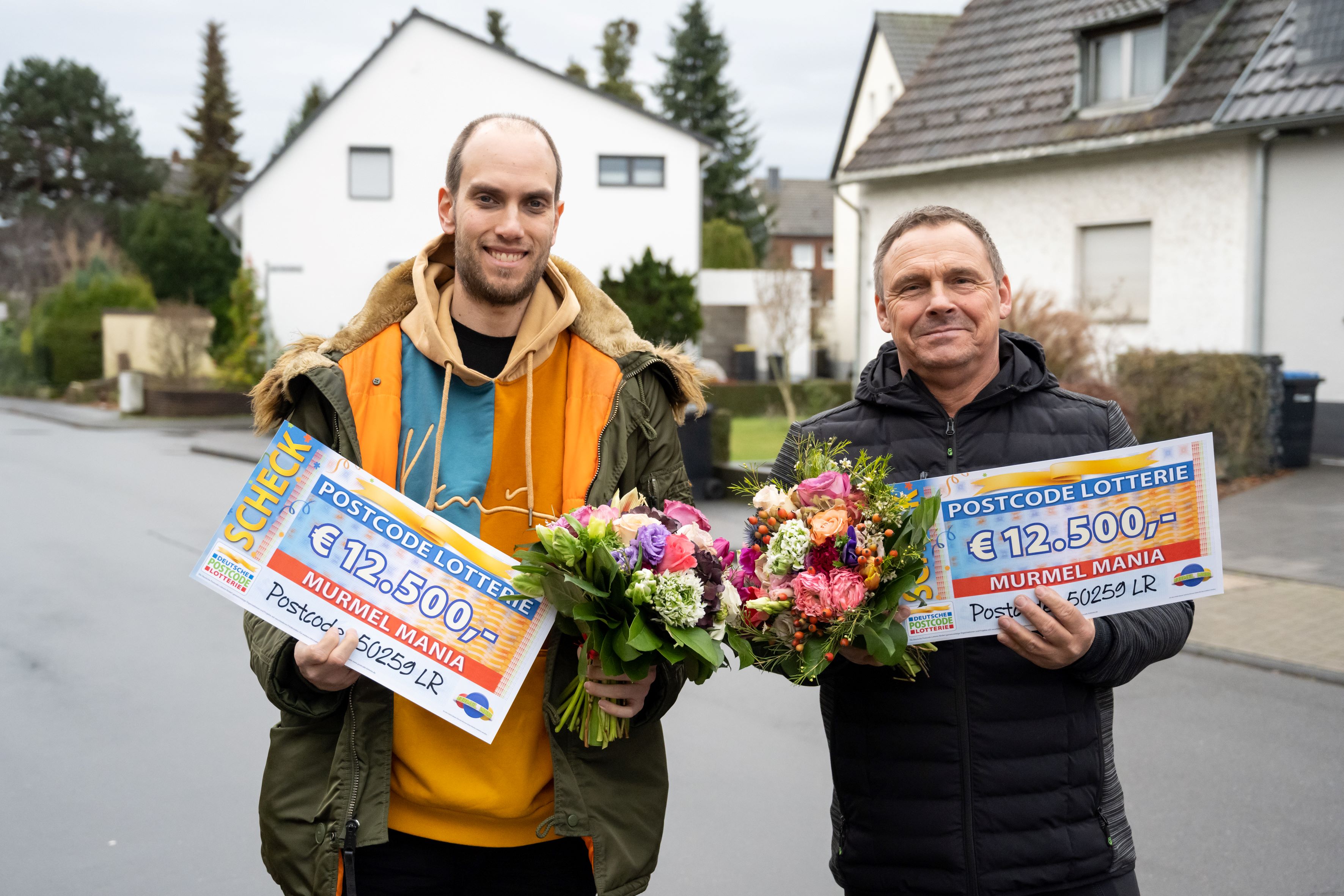 Im Finale der zweiten Folge von „Murmel Mania – Die deutsche Murmelmeisterschaft 2023“ am Freitag rollt eine rote Kugel als Erste ins Ziel. Das Publikum jubelt – aber auch die Teilnehmer*innen der Deutschen Postcode Lotterie haben Grund zur Freude. Denn durch die Murmelfarbe gewinnt auch der Postcode 50259 LR und damit vier Glückspilze in Pulheim bei Köln. Unter anderem Torsten* und Ralf* staunen nicht schlecht, als Lotterie-Glücksbote Felix Uhlig mit Blumen und Schecks über jeweils 12.500 Euro vor ihren Haustüren steht. Und Torsten weiß auch schon in etwa, was er mit dem Geld anfangen wird. „Wir planen einen schicken Urlaub“, sagt der 41-Jährige, während seine Frau zustimmend nickt. „Unser Traum ist Amerika.“ Der Gewinner-Postcode 50259 LR beschert aber nicht nur den vier Postcode-Gewinner*innen Glück. Weitere 50.000 Euro teilen sich alle Losbesitzer*innen mit der Postleitzahl 50259.