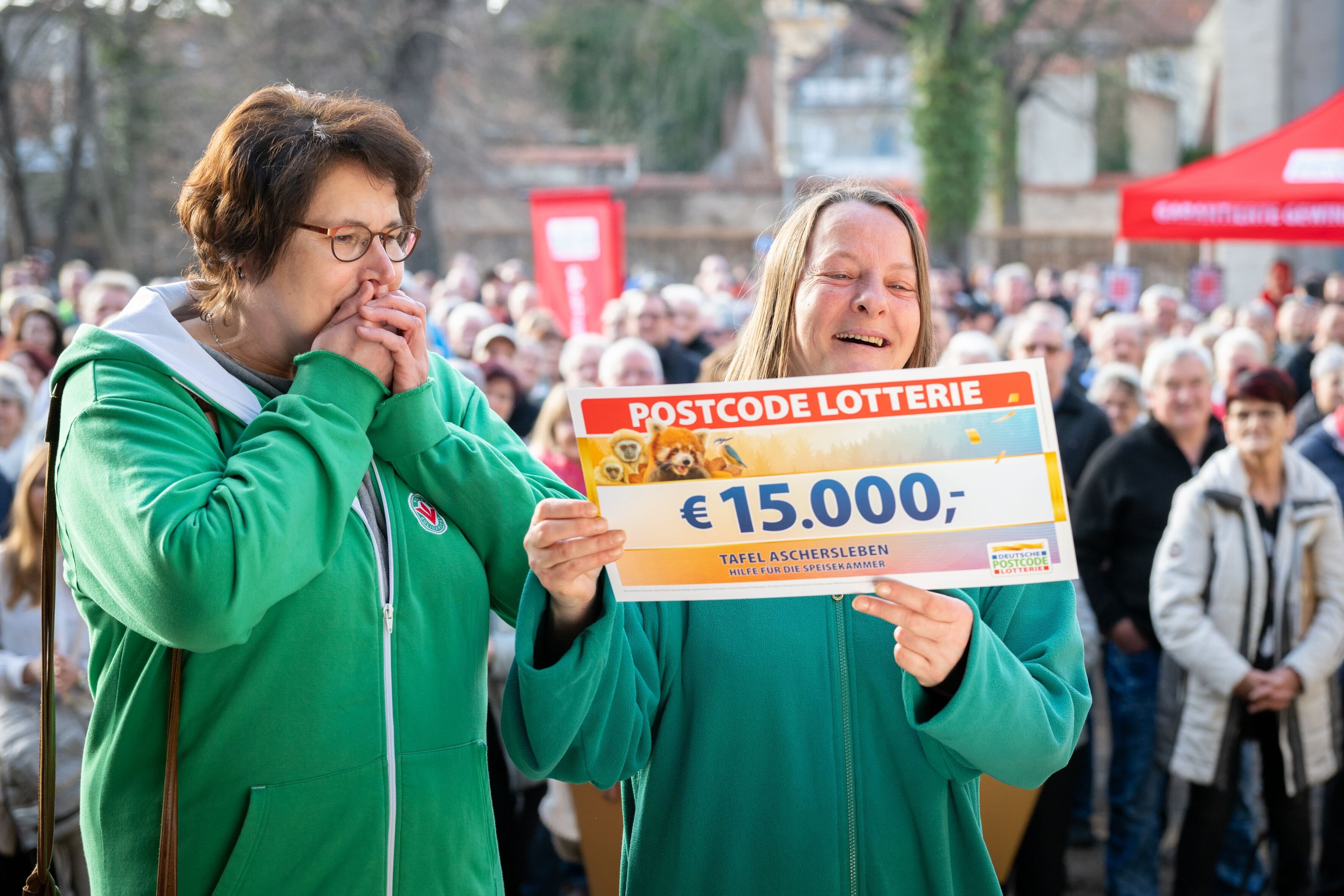 Bei der Postcode-Party ging es aber nicht nur um die Gewinner*innen, sondern auch um den guten Zweck. Kai-Gerrit Bädje, Vorsitzender des Landesverbands der Tafel Sachsen-Anhalt, erhielt einen symbolischen Scheck in Höhe von 250.000 Euro. Und Susanne Kilian vom Landesverband der Volkssolidarität in Sachsen-Anhalt, nahm stellvertretend für die Speisekammer Aschersleben einen Scheck über 15.000 Euro entgegen. „Unsere Arbeit ist nur möglich durch die vielen ehrenamtlichen Helfer und die finanzielle Unterstützung, die wir auch dank der hier anwesenden Teilnehmer der Deutschen Postcode Lotterie erhalten“, sagte Kilian. „Darum vielen, vielen Dank Ihnen allen.“