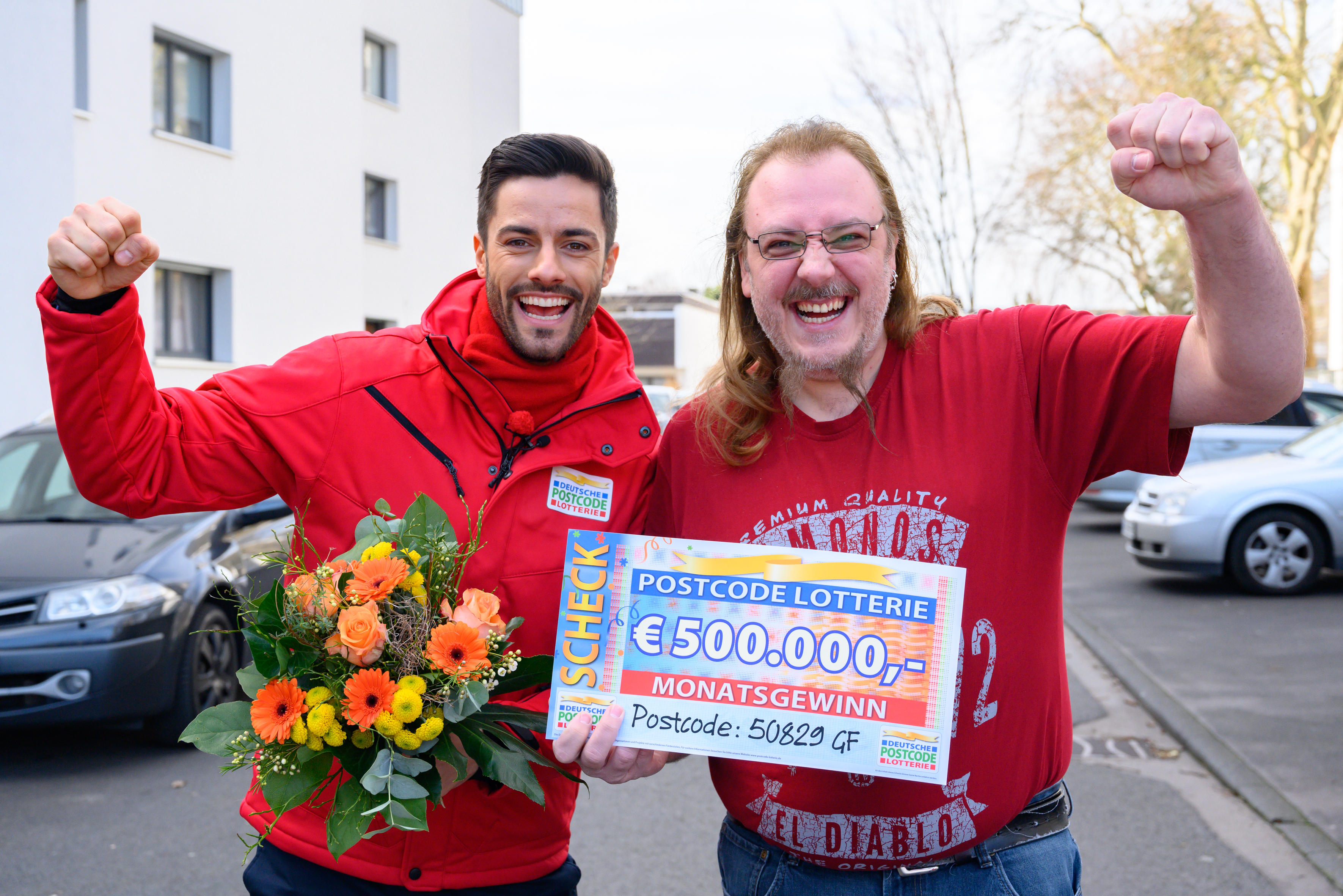 Jeden Monat aufs Neue wird der Postcode Monatsgewinn gezogen: Im Februar fällt dieser auf den Postcode 50829 GF von Manuel* aus Bocklemünd. Mit seinem Los bei der Soziallotterie gewinnt er eine halbe Million Euro, Straßenpreis-Moderator Giuliano Lenz überrascht ihn mit dem goldenen Umschlag. Eine weitere halbe Million Euro teilen sich 133 Teilnehmer in derselben Postleitzahl (50829).