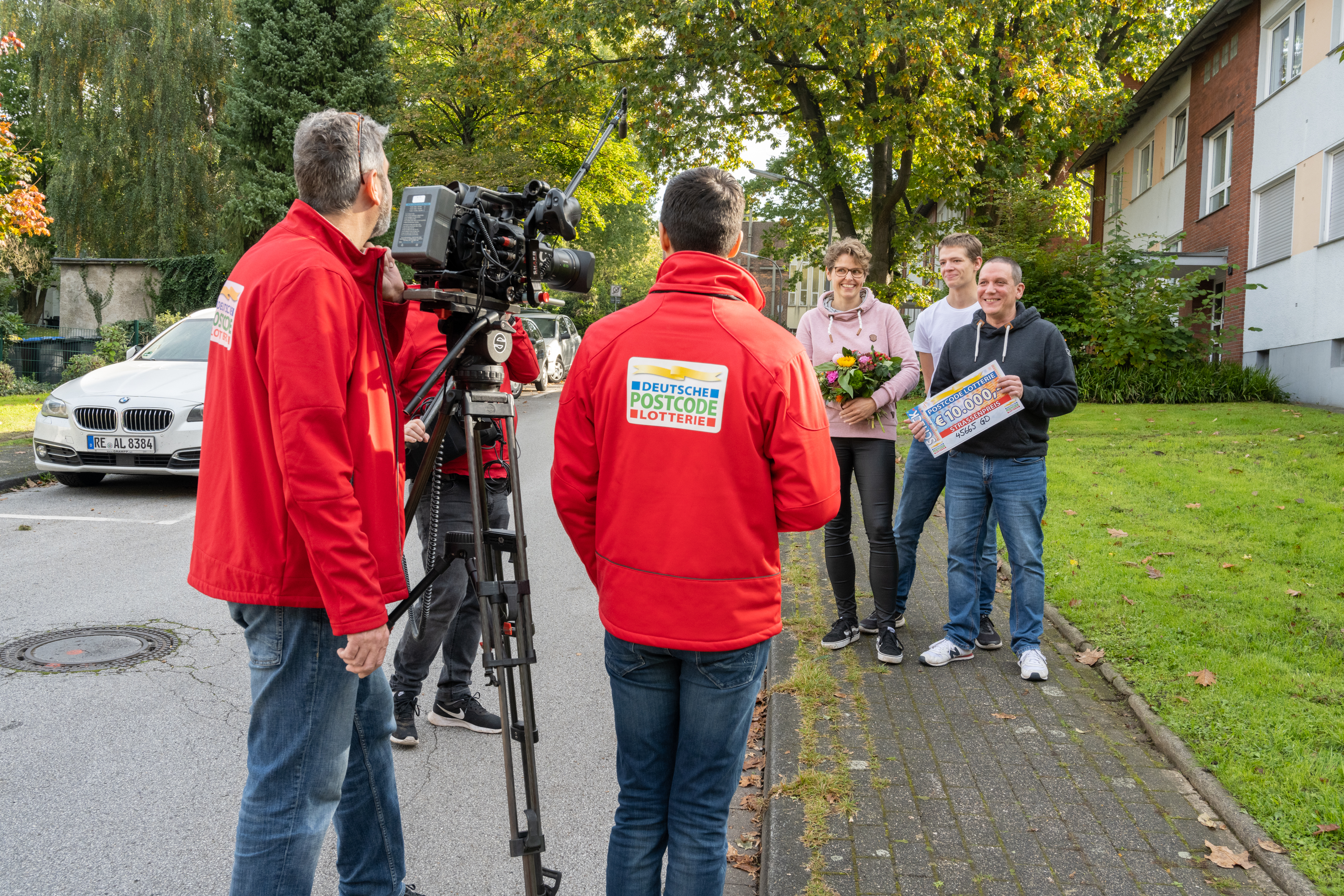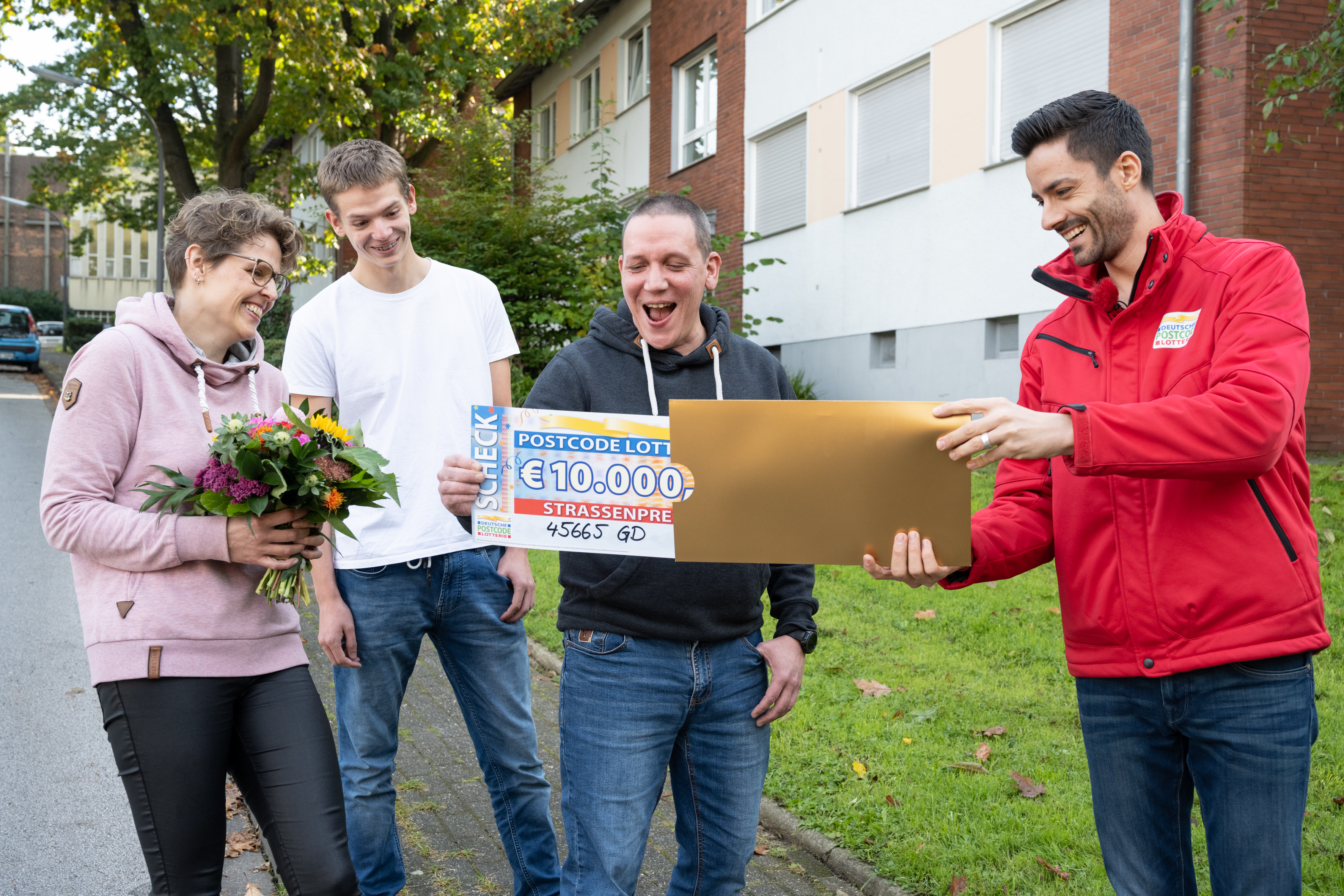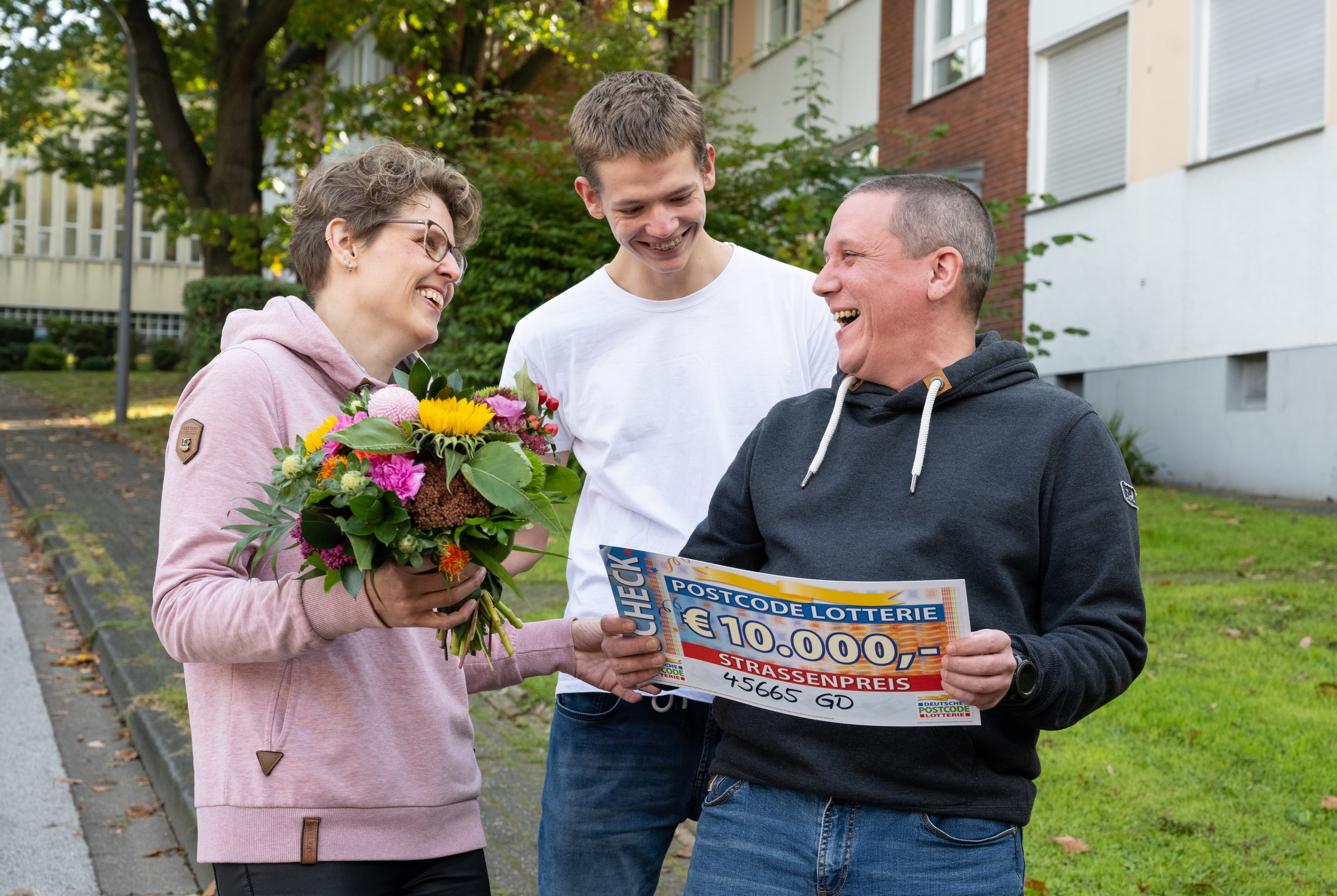 Seit ziemlich genau eineinhalb Jahren nimmt Michael mit seinem Los an den Ziehungen der Deutschen Postcode Lotterie teil. Und das hat sich gelohnt! Denn nachdem das Losglück dem 45-Jährigen bislang nur 10-Euro-Gewinne beschert hat, steht nun Straßenpreis-Moderator Giuliano Lenz vor seiner Tür – mit einem großen Blumenstrauß und einen dicken Scheck. „10.000 Euro - das sind jetzt ein paar Nullen mehr“, kommentiert Michael die Gewinnsumme grinsend. Ehefrau Stefanie* und Sohn Fynn* freuen sich natürlich mit. Vor allem der 19-Jährige hat allen Grund dazu: Er macht gerade seinen Führerschein „und dann will er auch ein Auto haben. Da ist jetzt bestimmt ein Zuschuss drin“, schmunzelt Vater Michael und fügt an das Team der Postcode Lotterie gewandt hinzu: „Danke, vielen Dank.“